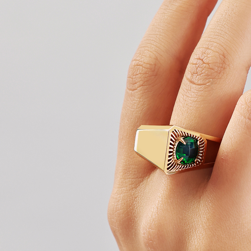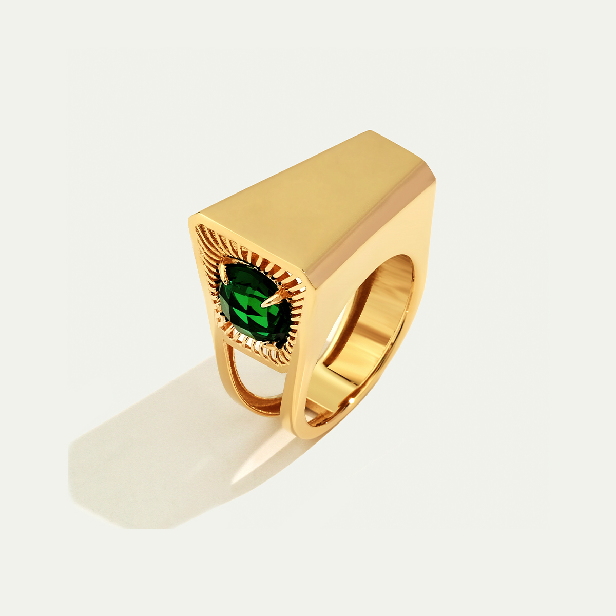 Modern mimari formlardan ilham alınarak tasarlanan  Electra 14 Ayar Yeşil Taşlı Yüzük, köşeli ve heykelsi görünümüyle güçlü bir stil vurgusu yapar. Yüzüğün alt kısmında özenle yerleştirilmiş yeşil taş, geometrik hatlara sofistike bir kontrast katar. Hem günlük kombinlerde hem de özel davetlerde farklı bir şıklık sunar. Regold logolu özel kutusunda ve garanti belgesi ile sunulmaktadır.