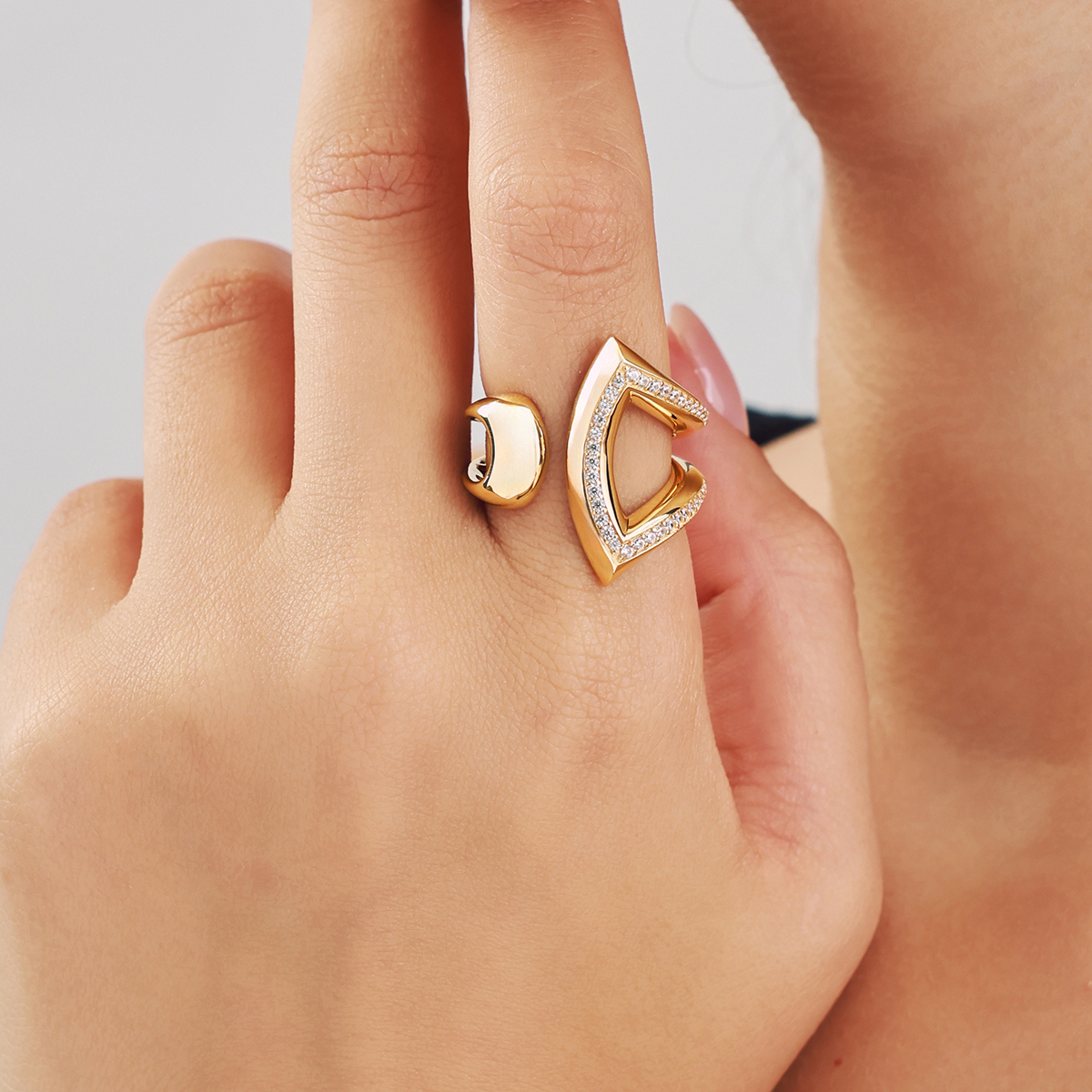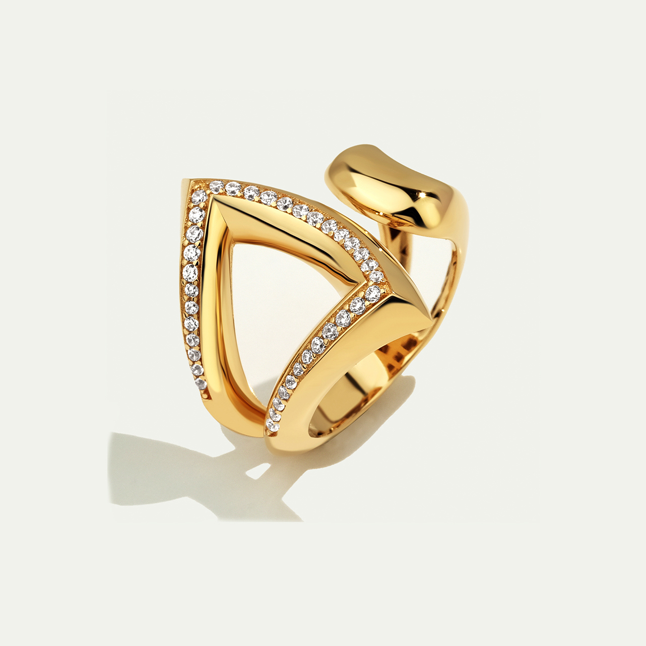 Şık ve modern tasarımıyla dikkat çeken 14 Ayar Altın Açık Formlu Taşlı Yüzük, üçgenimsi açık formu ve çevresini saran parlak taşlarıyla göz alıcı bir ışıltı sunar. Açık tasarımı sayesinde parmağa hafiflik kazandırırken, taşların zarif parıltısı sofistike bir duruş yaratır. Hem günlük kombinlerde stilinizi tamamlar hem de özel davetlerde iddialı bir aksesuar olarak öne çıkar.
