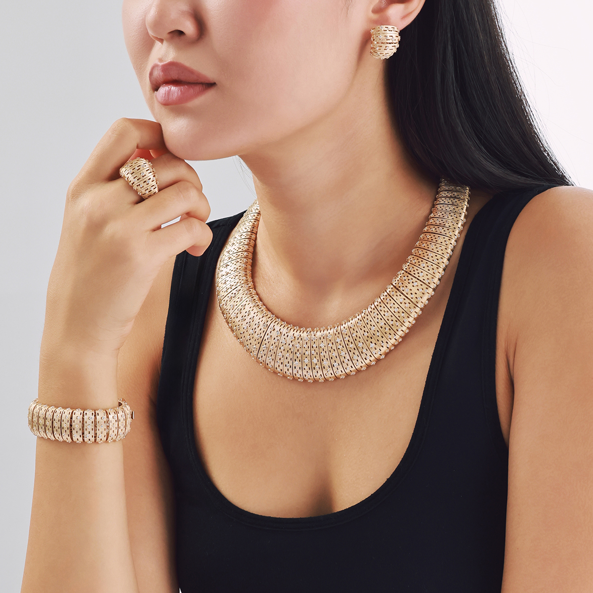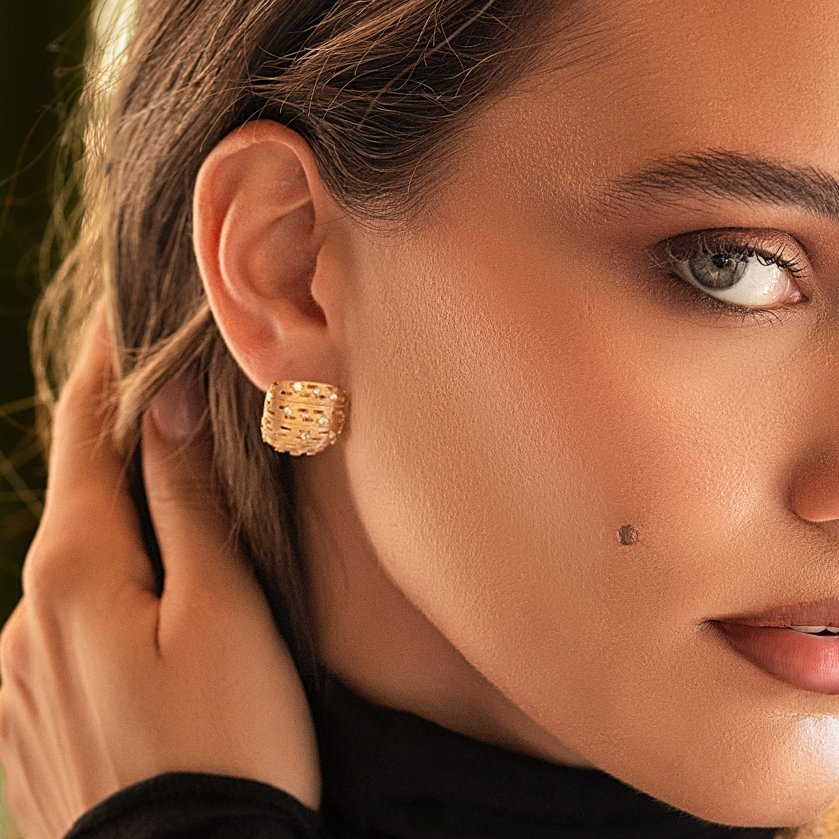 Işıltısı ve dokusuyla zarafeti buluşturan 14 Ayar Altın Ajurlu Taşlı Küpe, fırçalanmış altın yüzeyi boyunca dizili taşlarla göz kamaştırıyor. Bombeli formu, ışığı her açıdan yansıtarak sofistike bir derinlik yaratıyor. Modern çizgilerle klasik ışıltının mükemmel uyumunu yansıtan bu tasarım, her görünümü zarif bir ışıltıyla tamamlıyor. Regold logolu özel kutusunda ve garanti belgesiyle birlikte sunulmaktadır.