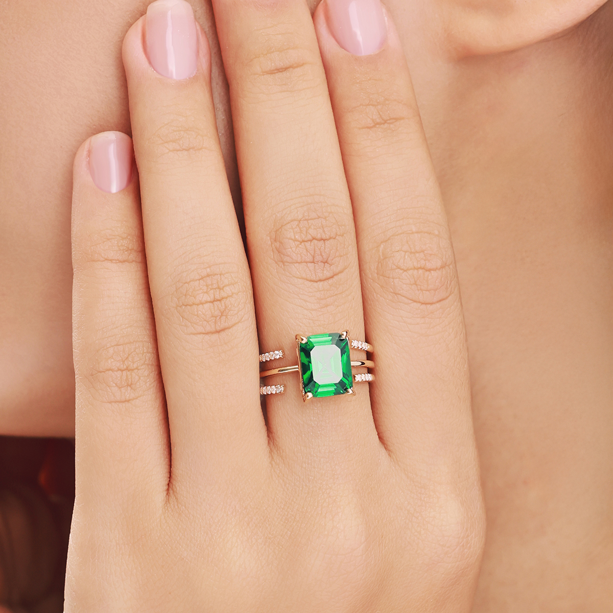 Gösterişli tasarımıyla dikkat çeken bu 14 ayar altın yüzük, ortasındaki büyük yeşil taşla güçlü bir şıklık sunar. Üç bantlı modern formu, yanlardaki küçük taş detaylarıyla bütünleşerek sofistike bir görünüm kazandırır. Hem özel günlerde iddialı bir aksesuar olarak hem de günlük kombinlerde fark yaratan bir parça olarak kullanılabilir.
