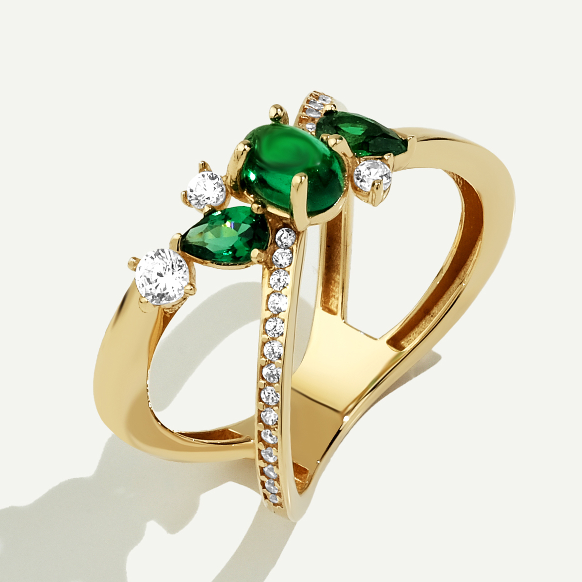 14 Ayar Altın Çapraz Formlu Yeşil Taşlı Yüzük