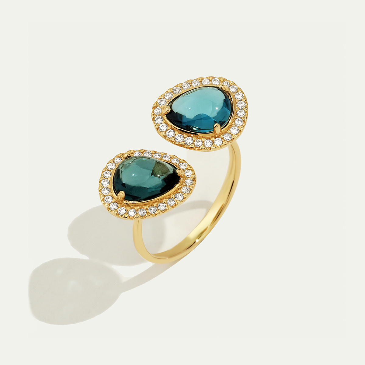 Göz alıcı tasarımıyla öne çıkan bu 14 ayar altın yüzük, iki adet mavi taşın çevresini saran parlak taş detaylarıyla ışıltılı bir görünüm sunar. Açık formuyla modern bir stil yakalayan yüzük, hem özel günlerde hem de günlük kombinlerde şıklığınızı tamamlar.