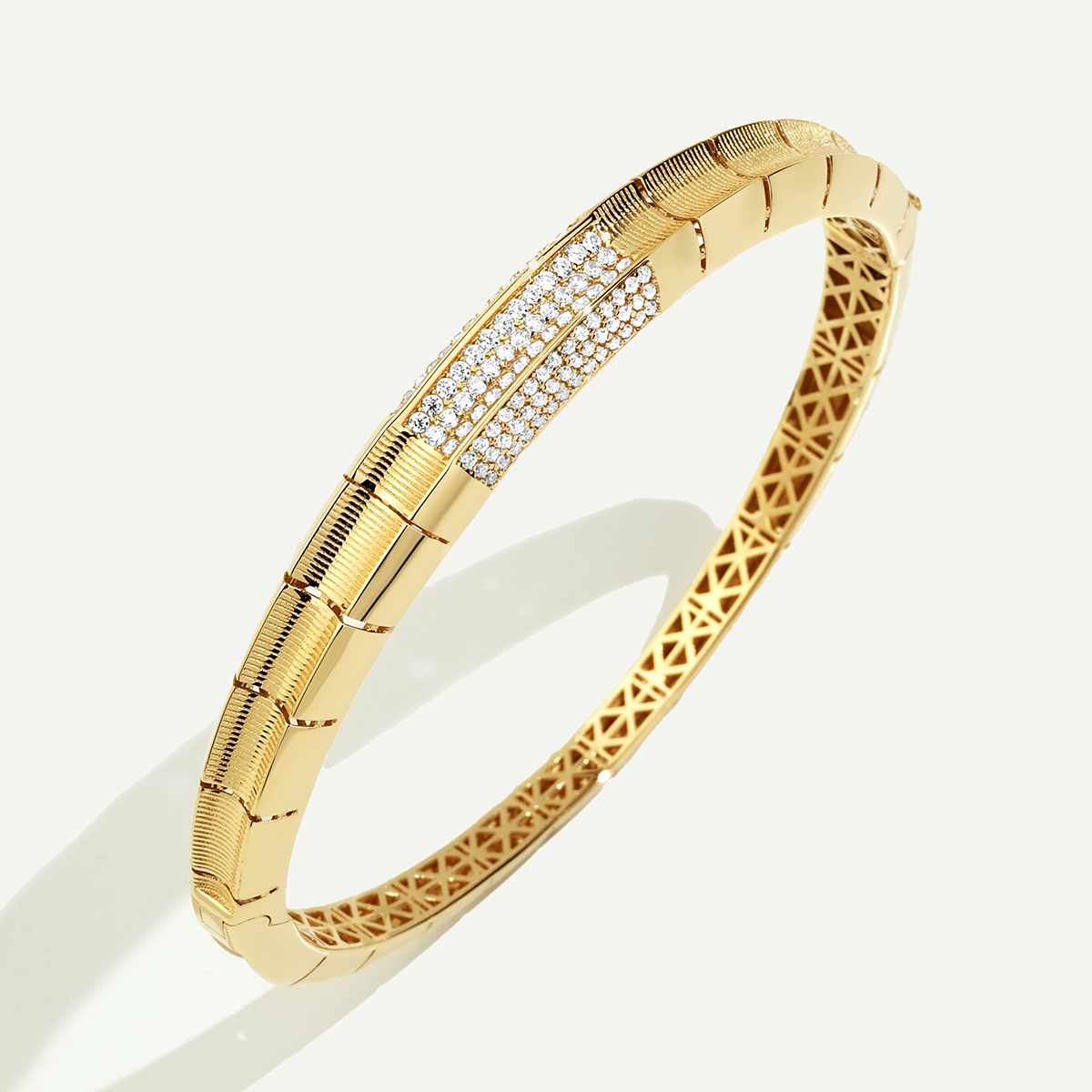 Benzersiz doku ve ışıltıyı bir araya getiren bu model, 14 Ayar Altın Çizgili Dokulu Taşlı Kelepçe, modern ve sanatsal bir zarafet sunar. Kelepçenin gövdesi, yatay çizgili özel dokuya sahip, birbirine kenetlenmiş altın segmentlerden oluşarak dinamik bir görünüm kazanır. Bu dokulu yapının tam merkezinde ise üç sıra pavé tekniğiyle yerleştirilmiş beyaz taşlar, yoğun ve çarpıcı bir parlaklık ile güçlü bir odak noktası oluşturur. İç yüzeyindeki lüks petek deseni işçilik kalitesini tamamlarken, bu mimari esintili kelepçe, stilinize sofistike ve iddialı bir dokunuş katacaktır. Regold logolu özel kutusunda ve garanti belgesi ile sunulmaktadır.