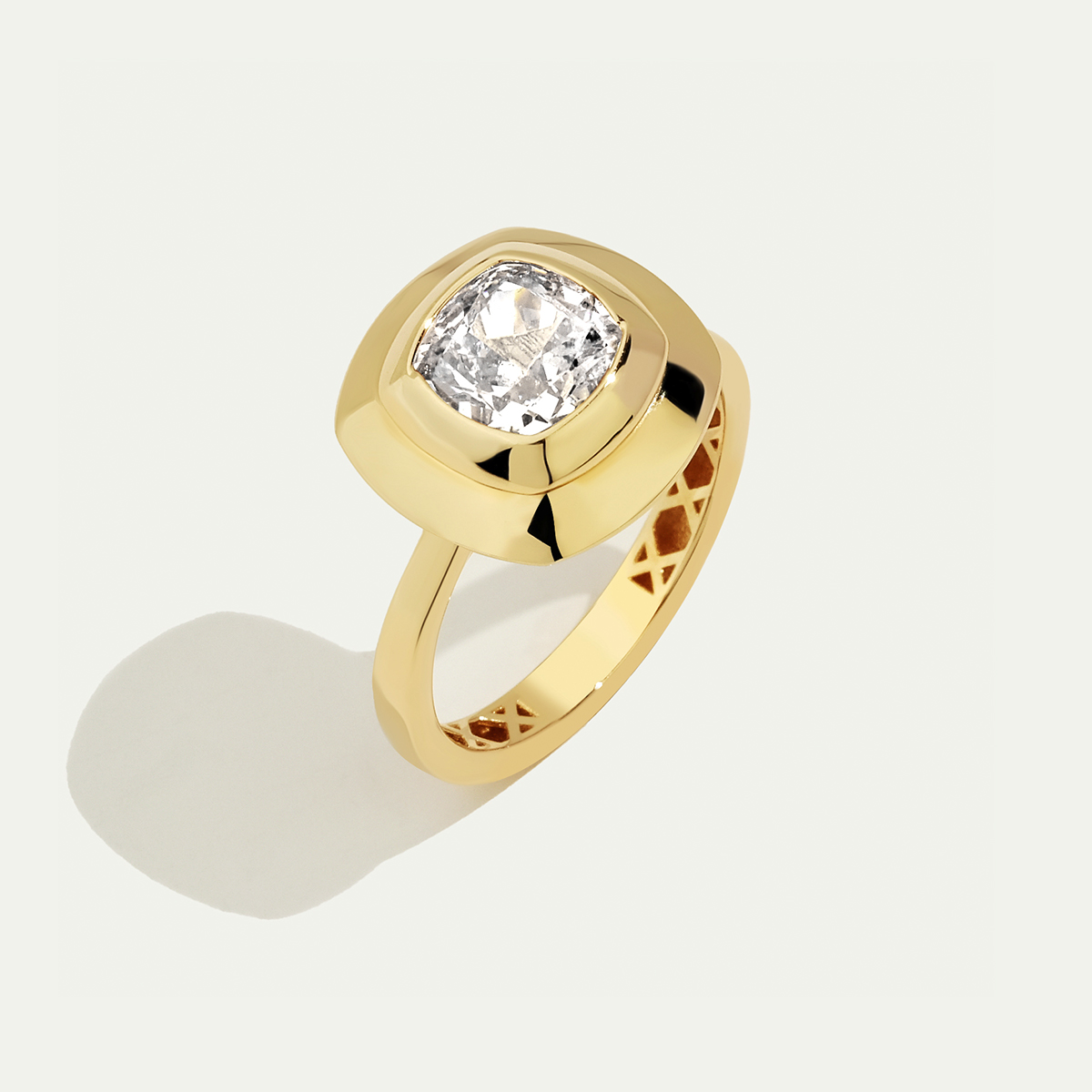 Klasik ve modern çizgileri bir araya getiren bu 14 ayar altın yüzük, merkezdeki cushion kesim taş detayıyla zarif bir şıklık sunuyor. Pürüzsüz altın yüzeyi ve güçlü formuyla hem gündelik hem de özel davetlerde stilinizi tamamlayacak zamansız bir parça.