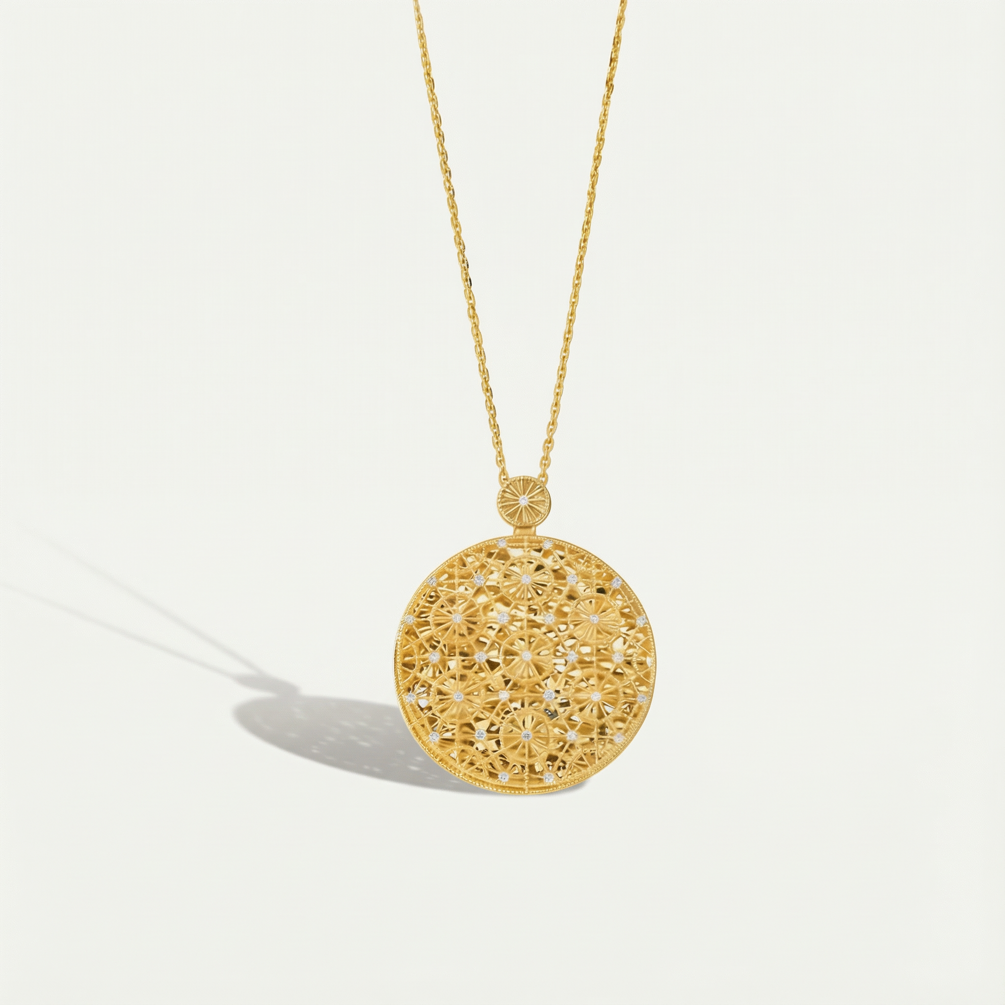 El işçiliğini andıran ince detaylarıyla öne çıkan 14 Ayar Altın Dantel İşlemeli Yuvarlak Kolye, dantel benzeri işlemeleriyle klasik ve zarif bir görünüm sunuyor. 14 ayar altından üretilen gurmet zincir, 45 cm uzunluğu ve 4 gram ağırlığıyla zarif bir duruş sunar. Işıltılı taş detaylarıyla hareket kazanan tasarım, nostaljik dokunuşu modern çizgilerle buluşturuyor. Hem günlük kullanımda hem de özel davetlerde şıklığınızı tamamlayacak eşsiz bir parçadır. Regold logolu özel kutusunda ve garanti belgesiyle sunulmaktadır.