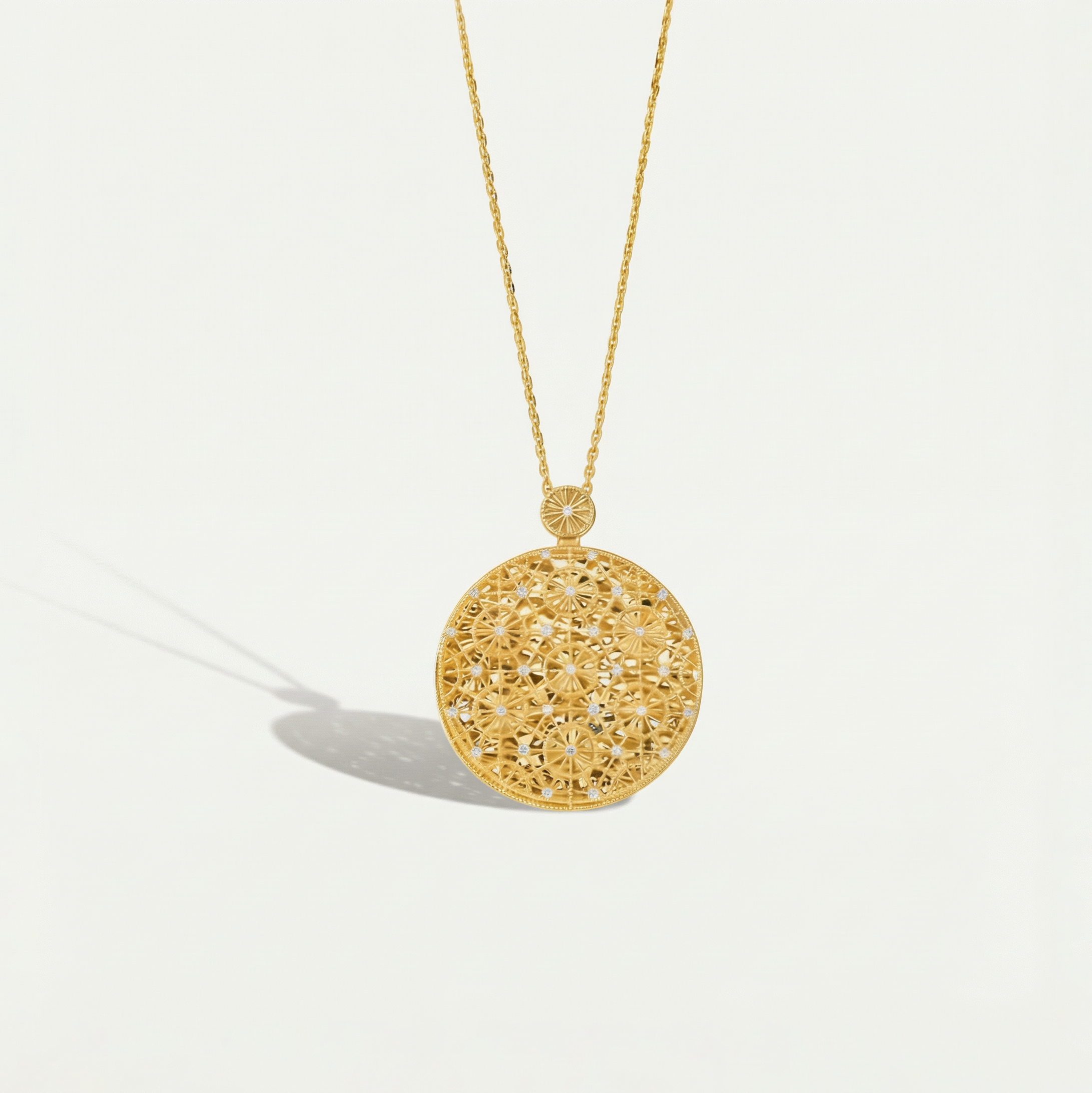 El işçiliğini andıran ince detaylarıyla öne çıkan 14 Ayar Altın Dantel İşlemeli Yuvarlak Kolye, dantel benzeri işlemeleriyle klasik ve zarif bir görünüm sunuyor. Kolye ucunun çapı 3 cm olan, 14 ayar altından üretilen gurmet zincir, 45 cm uzunluğu ve 4 gram ağırlığıyla zarif bir duruş sunar. Işıltılı taş detaylarıyla hareket kazanan tasarım, nostaljik dokunuşu modern çizgilerle buluşturuyor. Hem günlük kullanımda hem de özel davetlerde şıklığınızı tamamlayacak eşsiz bir parçadır. Regold logolu özel kutusunda ve garanti belgesiyle sunulmaktadır.