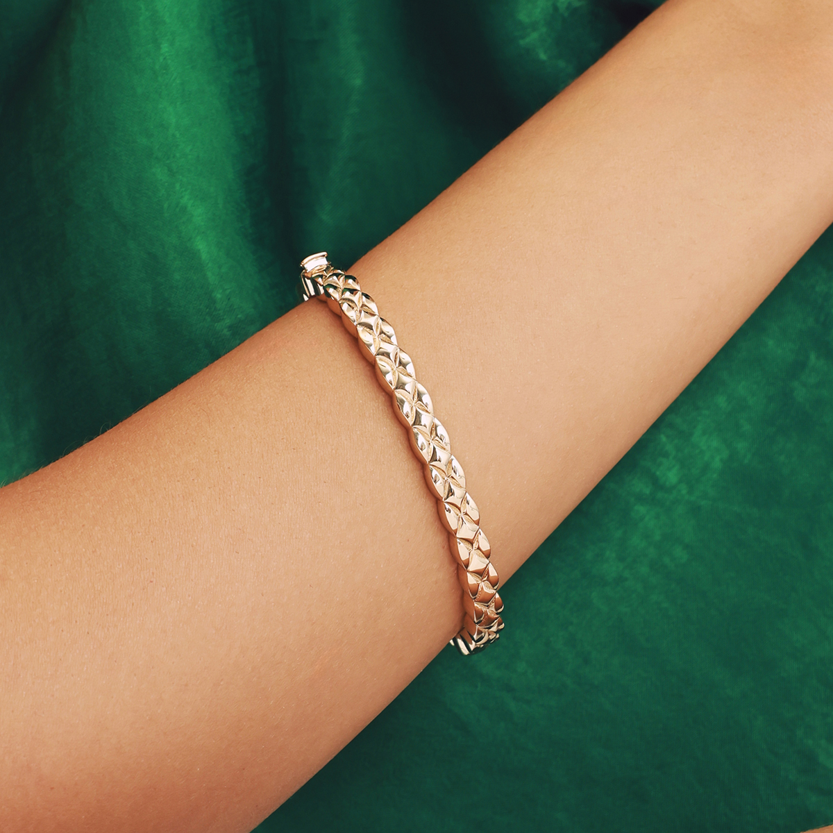 14 ayar altından üretilmiş bu desenli kelepçe, geometrik yüzey detaylarıyla modern ve şık bir görünüm sunar. Özgün tasarımı sayesinde günlük kombinlerinizi tamamlar, özel günlerde ise zarif bir dokunuş katar.