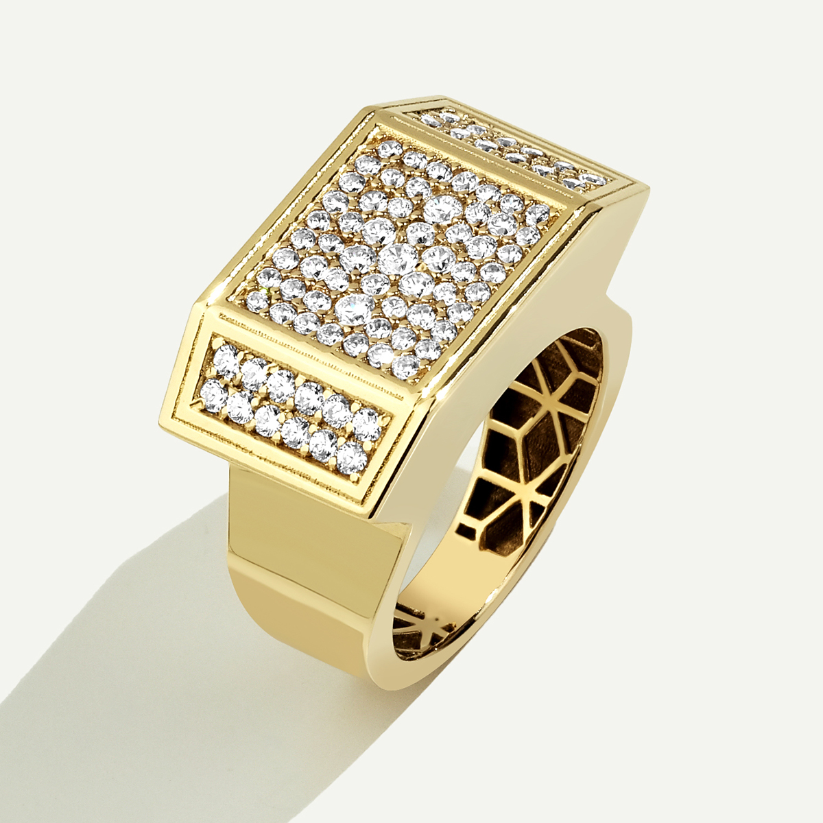 Zarif detaylarıyla dikkat çeken 14 Ayar Altın Dikdörtgen FormluTaşlı Yüzük, güçlü formu ve ışıltılı taş düzeniyle sofistike bir görünüm sunuyor. Üst kısmında dikdörtgen bir yüzey boyunca yerleştirilen küçük taşlar yoğun bir parlaklık yaratırken çevresini saran ince çerçeve yüzüğe mimari bir derinlik kazandırıyor. Yüzüğün keskin hatları modern bir duruş sergilerken iç kısmındaki geometrik desenli yapı tasarımın ince işçiliğini yansıtıyor. Hem klasik hem çağdaş çizgileri bir arada taşımak isteyenler için etkileyici bir seçim. Regold logolu özel kutusunda ve garanti belgesi ile sunulmaktadır.