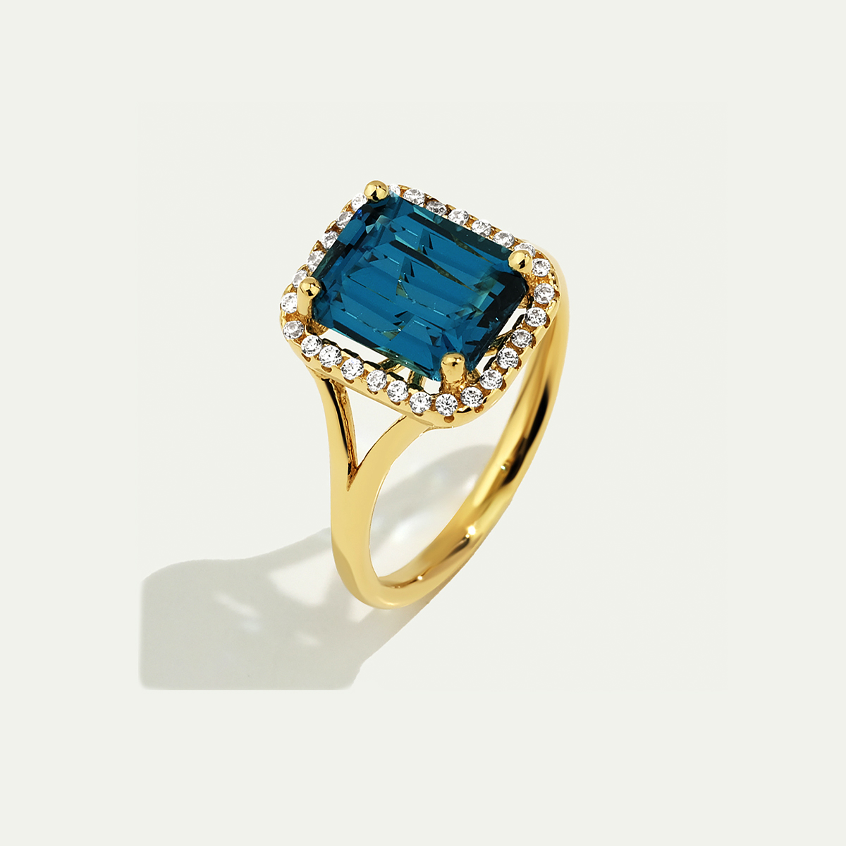 14 Ayar Altın Dikdörtgen Mavi Taşlı Yüzük