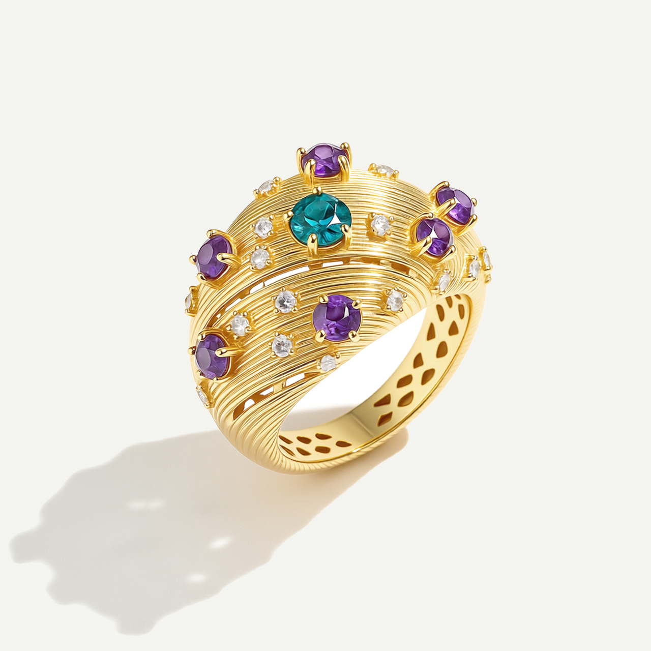 14 Ayar Altın Fırçalı Yüzeyli Mavi ve Mor Taşlı Yüzük
