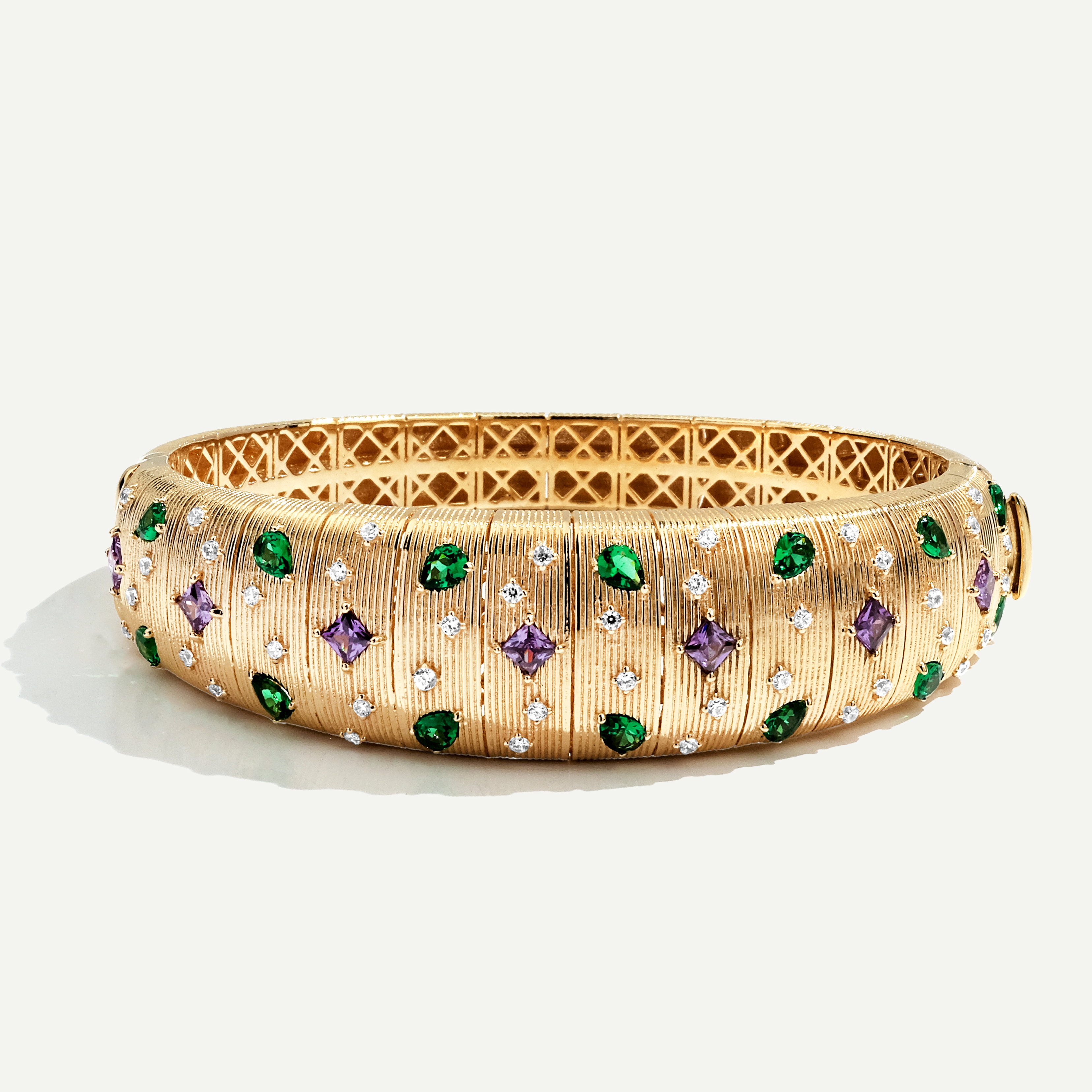 14 Ayar Altın Fırçalı Yüzeyli Mor ve Yeşil Taşlı Kelepçe