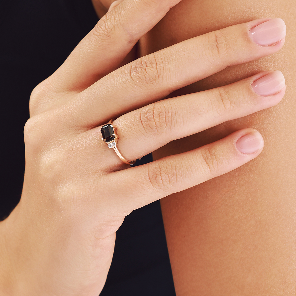 Zarafetin sade bir yansıması olan bu 14 ayar altın yüzük, ortasında yer alan dikdörtgen kesim kahverengi taş ile dikkat çeker. İki küçük parlak taşın eşlik ettiği tasarım, minimal ve romantik bir şıklık sunar. İnce formu sayesinde hem günlük kullanımda hem de özel anlarda zarif bir tamamlayıcı olarak tercih edilebilir.