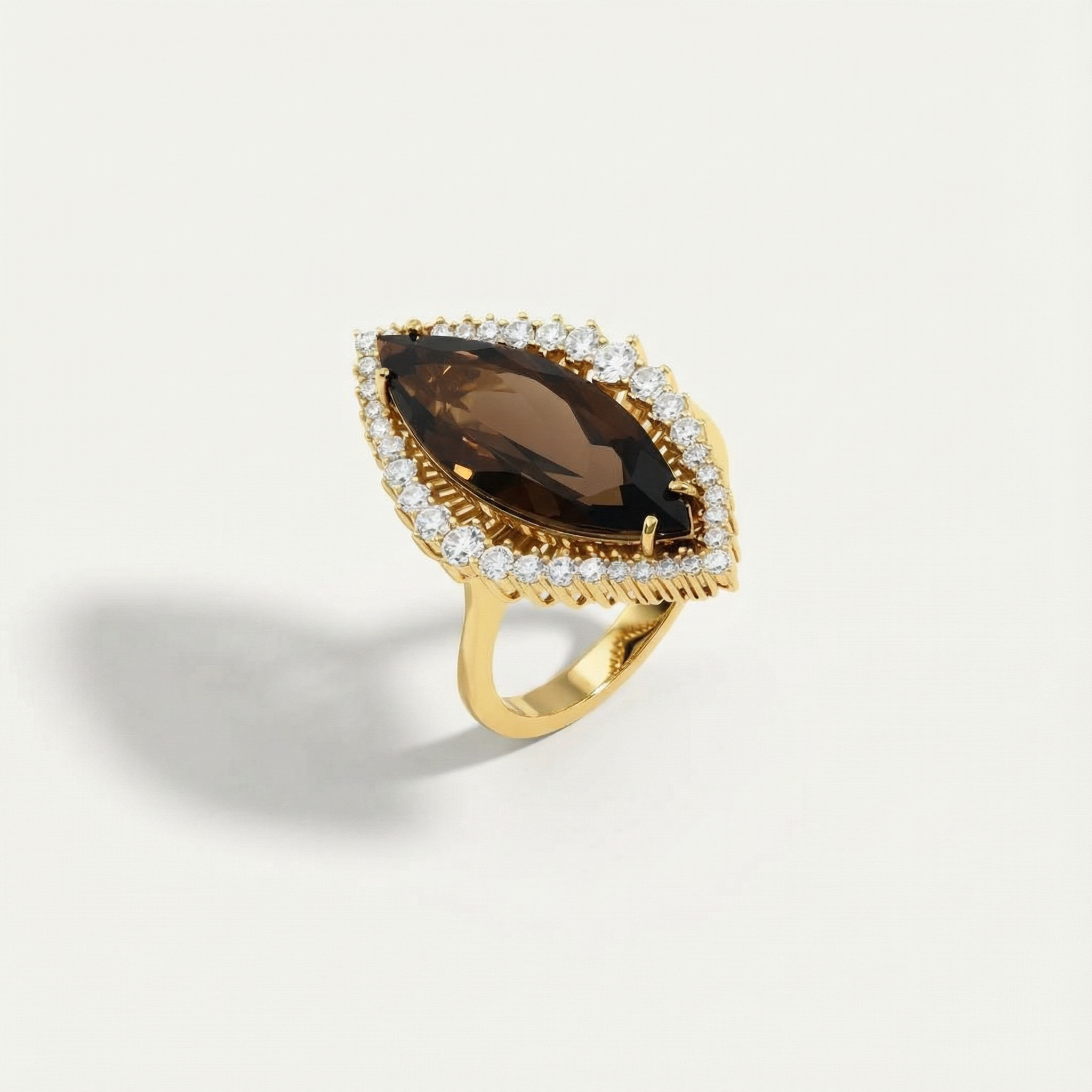 14 Ayar Altın Kahverengi Taşlı Pırlanta Görünümlü Yüzük, ihtişamlı tasarımıyla dikkat çekiyor. Markiz kesim kahverengi taşın etrafını saran parlak taş detayları, yüzüğe zarif bir ışıltı katıyor. Gösterişli tasarımıyla özel günlerde şıklığınızı ön plana çıkarır. Regold logolu özel kutusunda ve garanti belgesi ile sunulmaktadır.