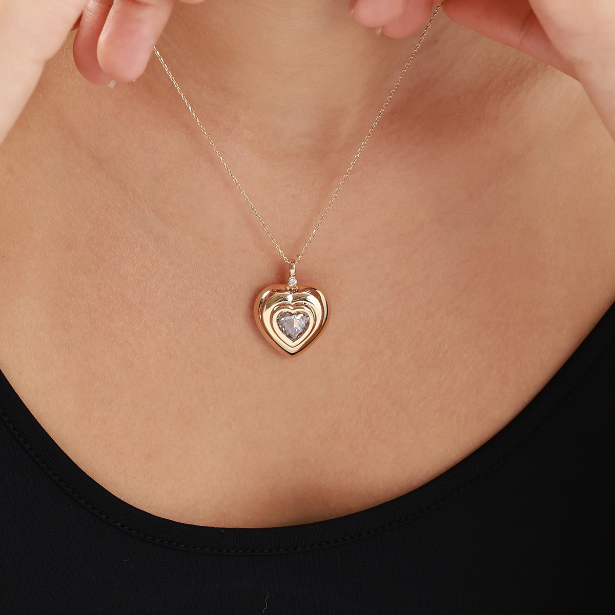 Sevginin ve zarafetin sembolü olan bu 14 ayar altın kalp motifli kolye ucu, ortasında parlayan taş detayı ile ışıltılı bir duruş sergiler. Kalbin merkezindeki taş, tasarıma romantik bir anlam katarken pırlanta ışıltısını andıran parlaklığıyla göz alıcı bir etki yaratır. Özel günlerde anlamlı bir hediye ya da günlük şıklığa romantik bir dokunuş için ideal bir parçadır.