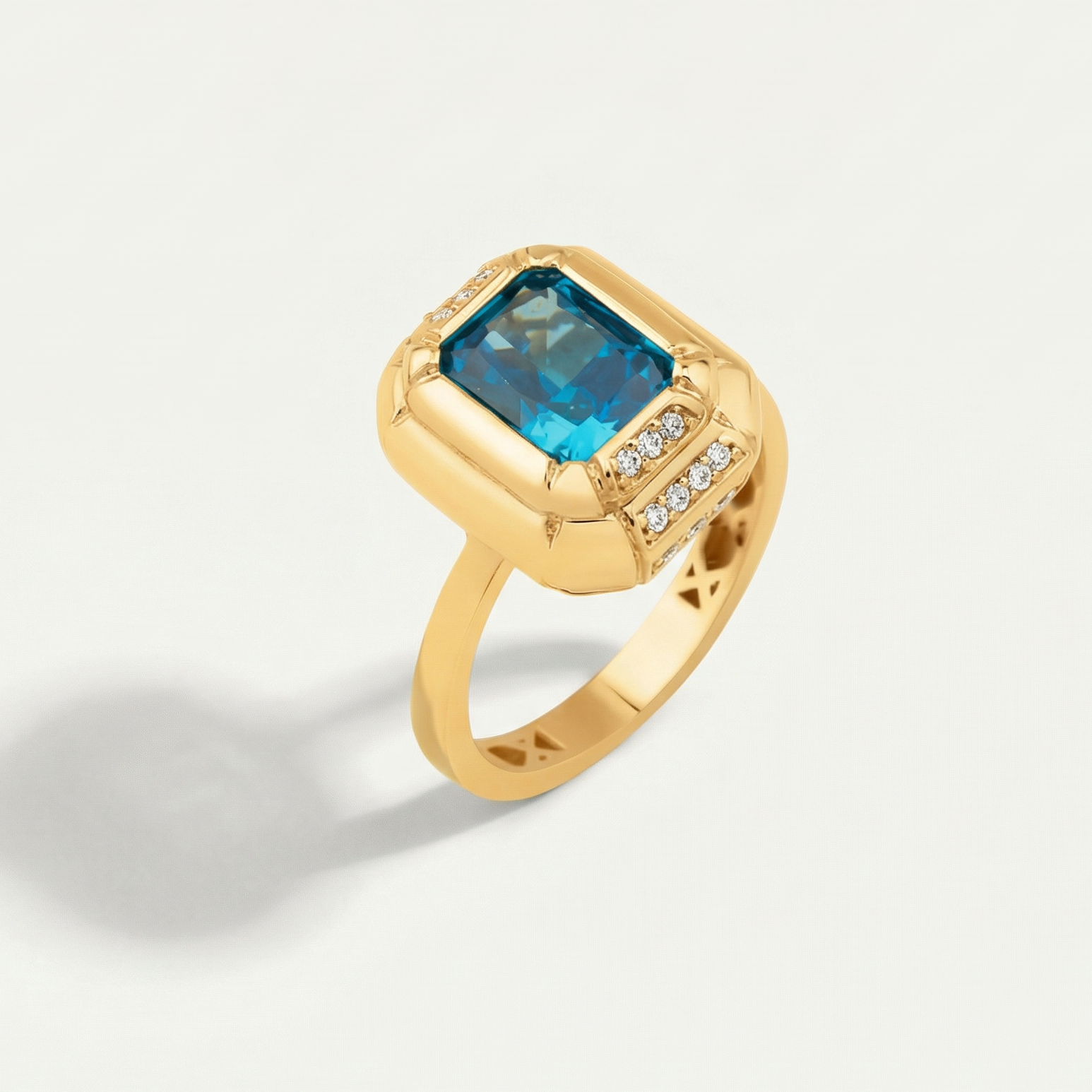 14 Ayar Altın Köşeli Mavi Taşlı Yüzük