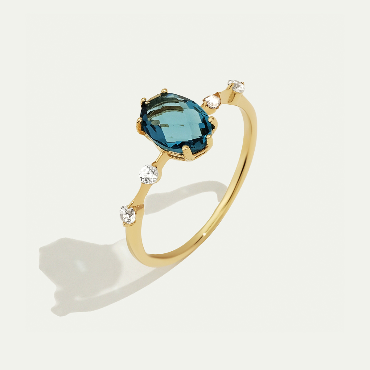 Minimalist tasarımıyla öne çıkan bu 14 ayar altın yüzük, merkezdeki koyu mavi oval taş ve yanlara yerleştirilmiş parlak taşlarla zarif bir görünüm sunar. İnce formu sayesinde hem günlük kullanımda hem de özel günlerde şıklığınıza zarif bir dokunuş katar.
