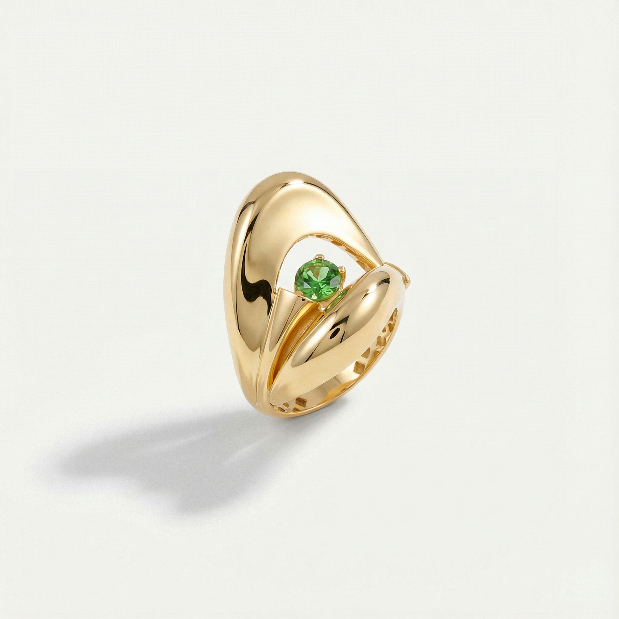 Küçük ama etkileyici yeşil taşıyla öne çıkan bu yüzük, 14 ayar altının sıcaklığıyla birleşerek sofistike bir görünüm yaratır. Günlük kombinlerinize canlı bir renk dokunuşu katar. Regold logolu özel kutusunda ve garanti belgesi ile sunulmaktadır.