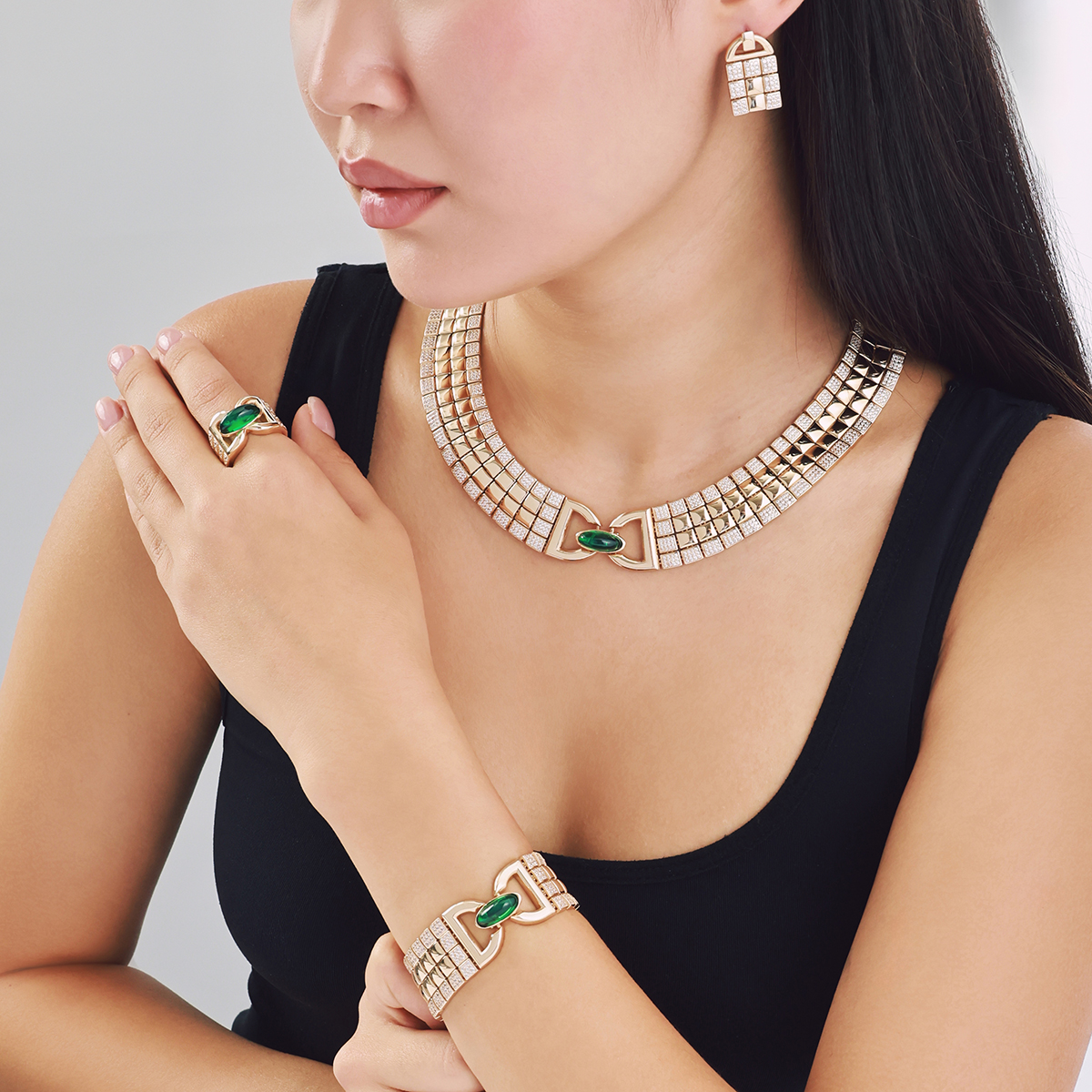 Doğanın huzurunu yansıtan derin yeşil tonlar, 14 ayar altının sıcak parıltısıyla buluşarak kusursuz bir uyum yaratıyor. Ortasında göz alıcı yeşil taşların yer aldığı kolye, yüzük, küpe ve bilezik, parlak taşlarla çevrilerek ihtişamlı bir bütünlük kazanıyor. Modern tasarımıyla cesur bir ifade sunarken, zarif işçiliğiyle sofistike bir şıklık katıyor. Günlük stilini tamamlamak ya da özel anlarda göz kamaştırıcı bir bütünlük yaratmak için bu set, zamansız bir tercih olacaktır. Regold logolu özel kutusunda ve garanti belgesi ile sunulmaktadır.