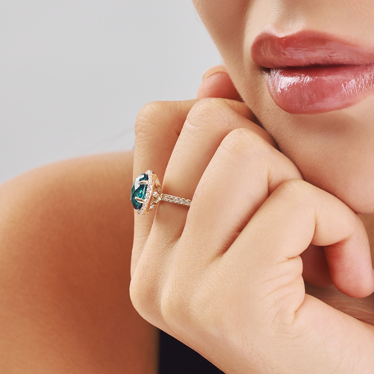 Zarafeti ve ihtişamı buluşturan bu 14 ayar altın yüzük, göz alıcı mavi taşın ışıltısıyla ön plana çıkıyor. Etrafını saran küçük taş detayları, merkezdeki oval taşın parlaklığını daha da vurgularken, ince ve zarif tasarımıyla hem günlük kullanıma hem de özel davetlere uyum sağlıyor.