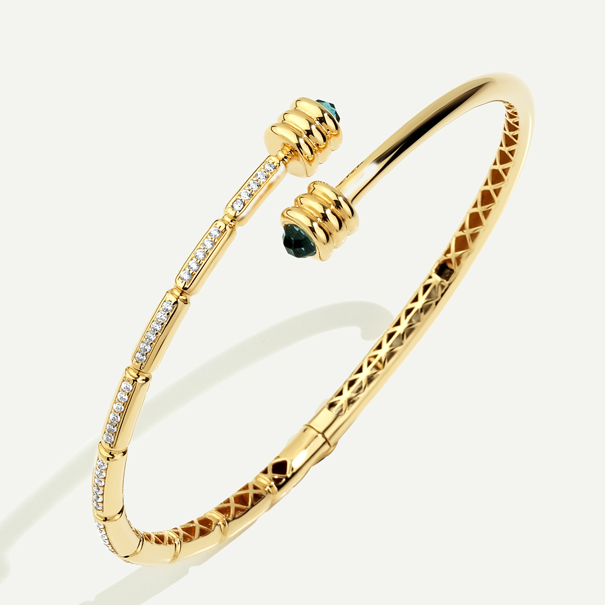 Mimari şıklık ve göz alıcı zarafeti birleştiren bu eşsiz tasarım, 14 Ayar Altın Minimal Mavi Taşlı Kelepçe adıyla, parlak altından üretilmiş açık formlu bir bileziği ifade eder. Kelepçenin her iki ucu, derin mavi renkteki büyüleyici, yivli silindir formlu taş detaylarıyla vurgulanır. Ayrıca gövdenin ön yüzeyi, zarif dikey barlar içine yerleştirilmiş parıltılı beyaz taş sıralarıyla dikkat çekici bir ışıltı sunar. Çapraz desenli iç yüzey detayıyla lüks bir incelik kazanan bu model, modern stilinize sanatsal ve cesur bir dokunuş katmak için ideal bir statement parçadır. Regold logolu özel kutusunda ve garanti belgesi ile sunulmaktadır.