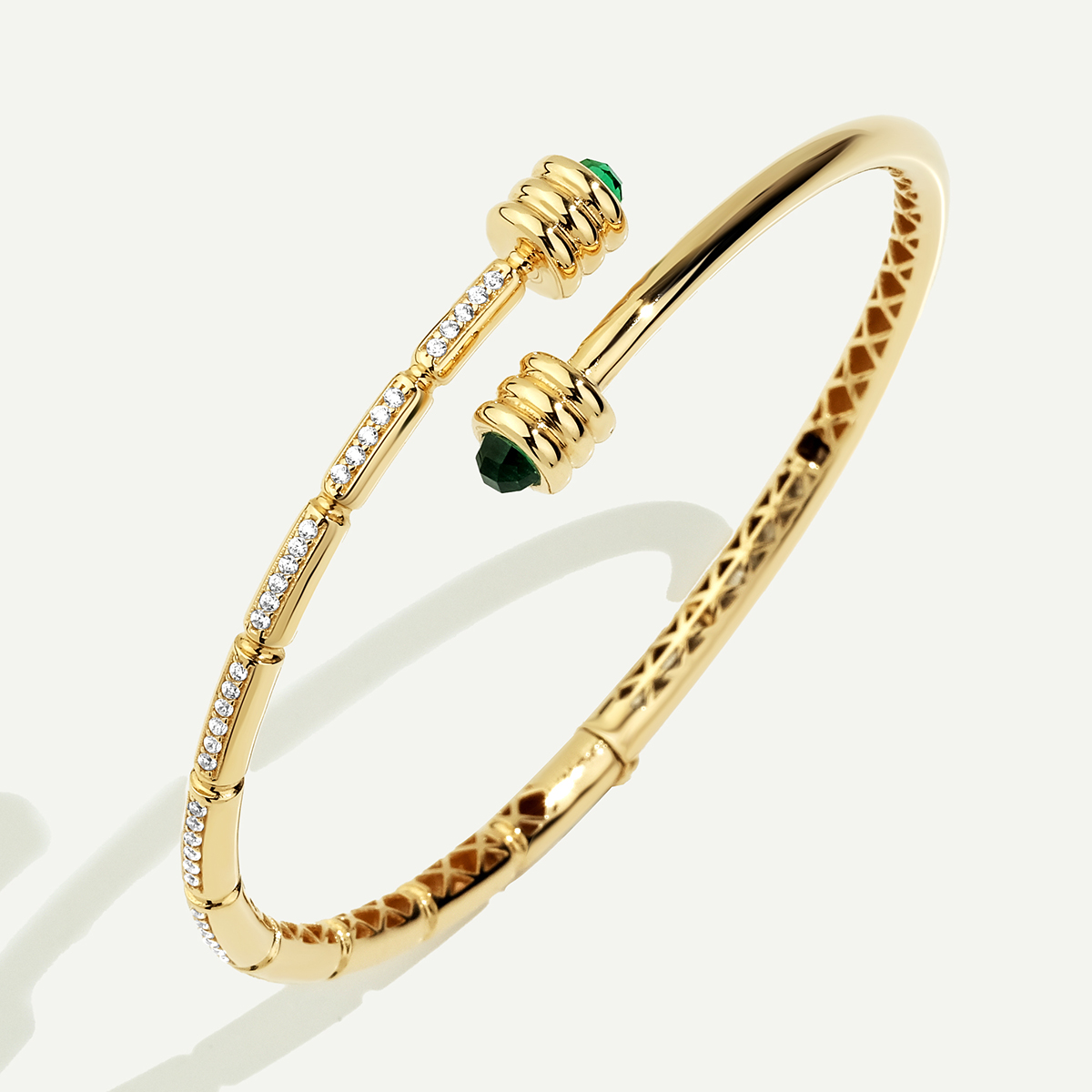 Mimari şıklık ve göz alıcı zarafeti birleştiren bu eşsiz tasarım, 14 Ayar Altın Minimal Yeşil Taşlı Kelepçe, parlak altından üretilmiş açık formlu bir bileziği ifade eder. Kelepçenin her iki ucu, yeşil renkteki büyüleyici, yivli silindir formlu taş detaylarıyla vurgulanır. Ayrıca gövdenin ön yüzeyi, zarif dikey barlar içine yerleştirilmiş parıltılı beyaz taş sıralarıyla dikkat çekici bir ışıltı sunar. Çapraz desenli iç yüzey detayıyla lüks bir incelik kazanan bu model, modern stilinize sanatsal ve cesur bir dokunuş katmak için ideal bir parçadır.Regold logolu özel kutusunda ve garanti belgesi ile sunulmaktadır.