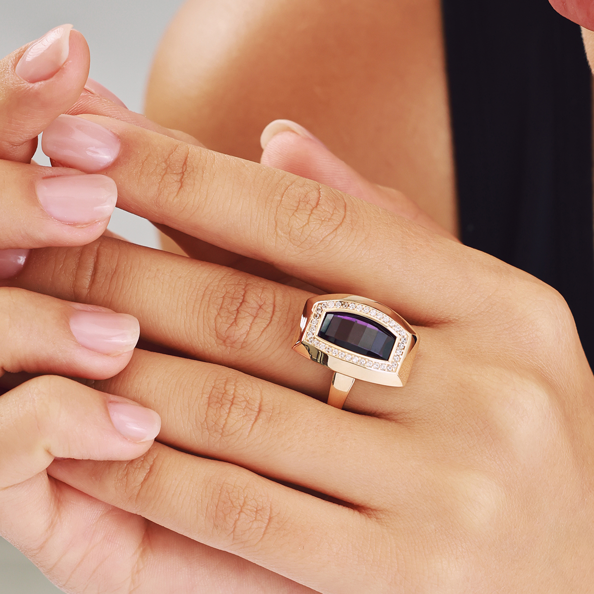 Gösterişli ve zarif tasarımıyla öne çıkan bu 14 ayar altın yüzük, merkezdeki dikdörtgen mor taş ve etrafını saran parlak taş sıralarıyla dikkat çeker. Altının parlak yüzeyiyle taşların ışıltısı birleşerek sofistike bir şıklık yaratır. Özel günlerde iddialı bir tamamlayıcı, günlük kombinlerde ise stilinizi güçlendiren özgün bir parça olarak kullanılabilir.