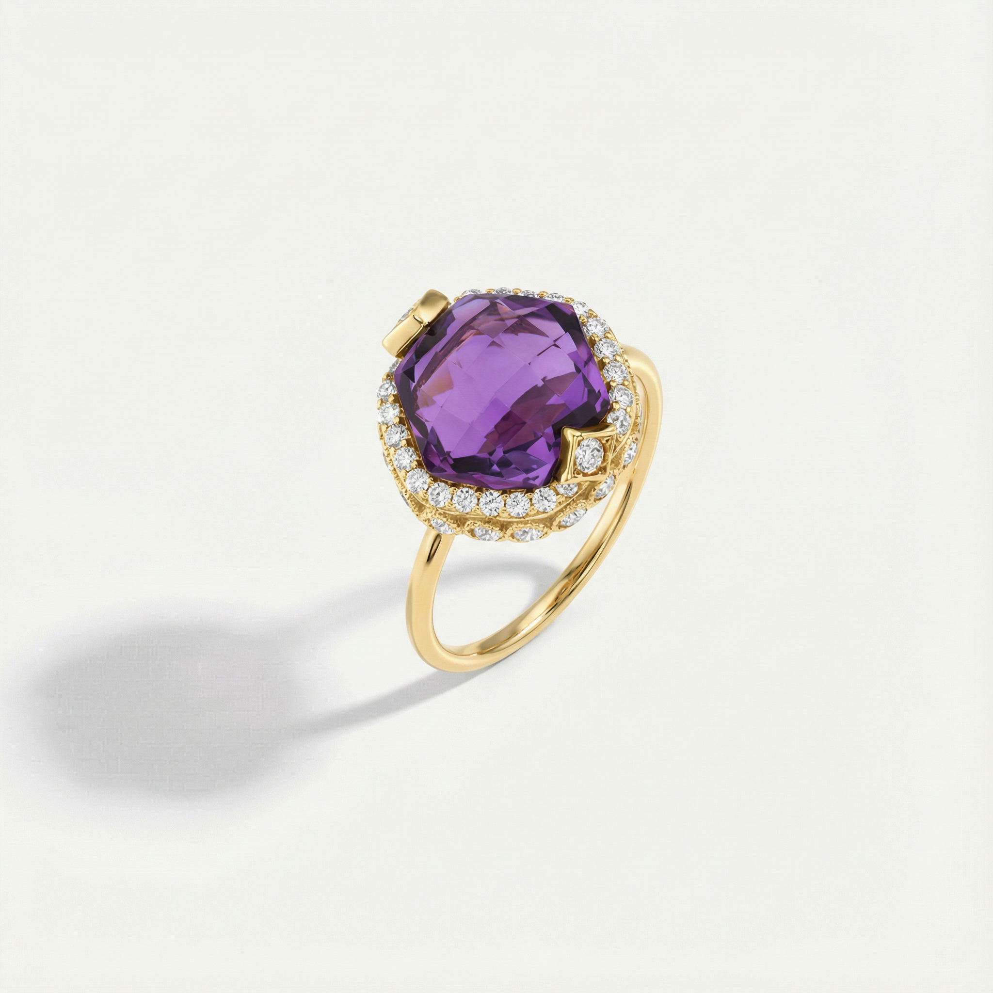 Zarif mor taşın çevresini saran parlak detaylarla öne çıkan anturaj yüzük, 14 ayar altınla birleşerek sofistike bir görünüm sunar. Renkli taşın ihtişamı ve klasik anturaj işçiliği, yüzüğe göz alıcı bir karakter kazandırıyor. Regold logolu özel kutusunda ve garanti belgesi ile sunulmaktadır.