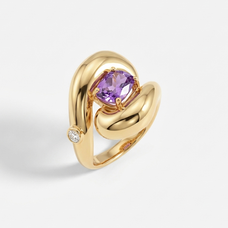 Romantik mor taşın asaletini yansıtan bu 14 ayar altın yüzük, inceliğiyle ön plana çıkar. Minimal taş detaylarıyla zenginleştirilen tasarım, her kombine zarafet katar. Regold logolu özel kutusunda ve garanti belgesi ile sunulmaktadır.