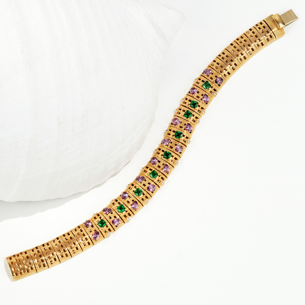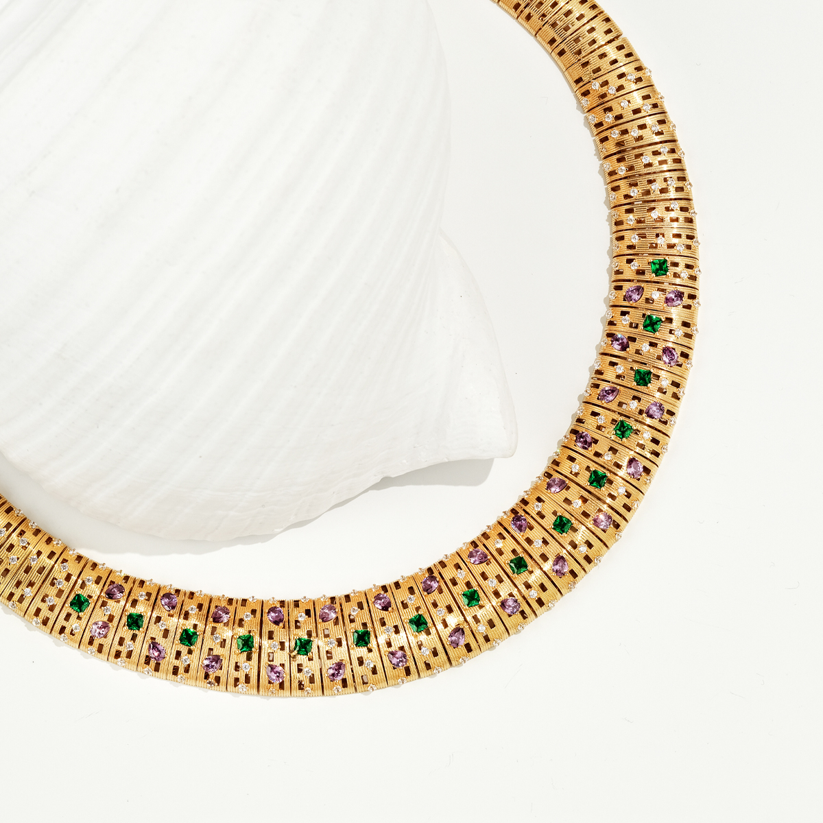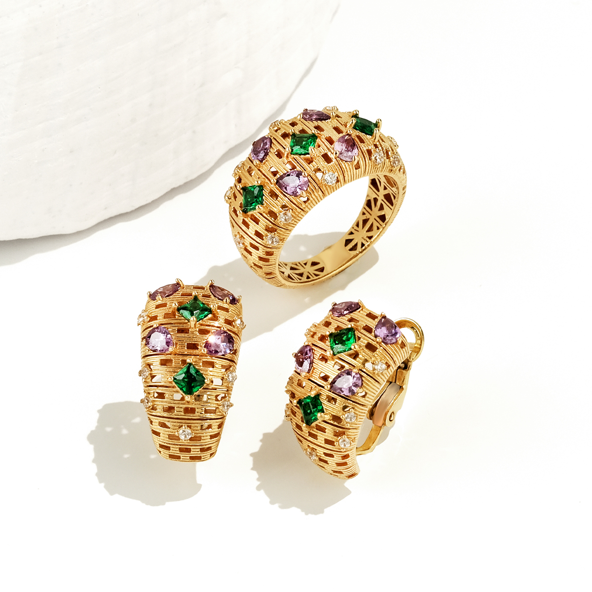 Işıltılı detaylarıyla dikkat çeken 14 Ayar Altın Mor ve Yeşil Taşlı Set, mor ve yeşil taşların zarif uyumunu altının sıcak tonuyla buluşturuyor. Kolyeden bilekliğe, küpeden yüzüğe kadar her parçada yer alan taş dizilimi tasarıma canlı bir ritim kazandırıyor. Geniş formdaki kolye ve bileklik, klasik şıklığı güçlü bir duruşla yansıtırken, küpe ve yüzükteki ince işçilik bütünlüğü tamamlıyor. Renklerin enerjisiyle sofistike bir görünüm sunan bu set, özel davetlerde gösterişli bir zarafet hissi uyandırıyor. Regold logolu özel kutusunda ve garanti belgesiyle birlikte sunulmaktadır.