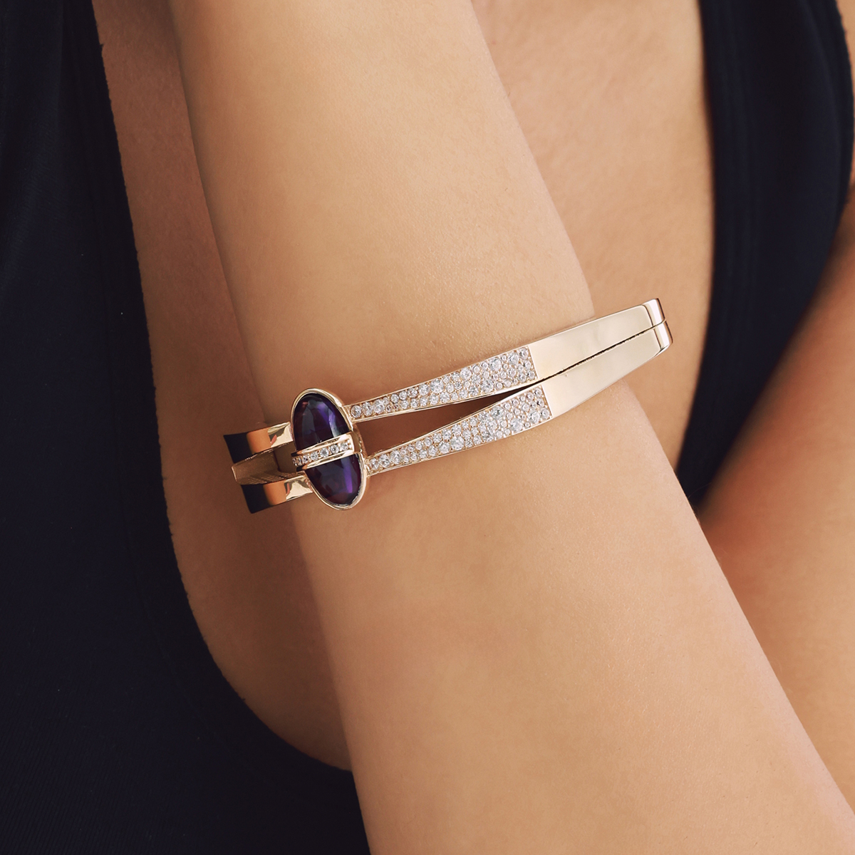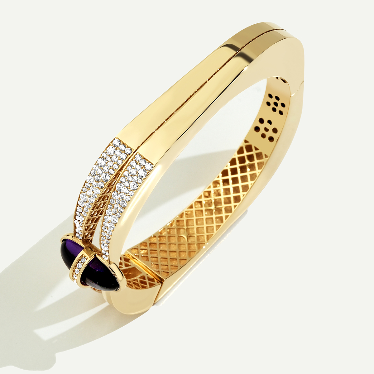 Mimari formu ve cesur taş kullanımıyla dikkat çeken 14 Ayar Altın Oval Formlu Mor Taşlı Kelepçe, zengin ve iddialı bir zarafet sunar. Kelepçenin yan kısmında yer alan pürüzsüz, derin mor renkteki büyük taş, etrafını saran çift sıra parıltılı beyaz taş detayı ile çarpıcı bir kontrast oluşturur. Yüksek parlaklıktaki altından üretilen ve yüzeyinde çift sıra ışıltılı taş detayı taşıyan bu model, iç kısmındaki özel petek deseni ile lüks bir işçiliğe sahiptir. Bu gösterişli parça, özel günlerinizin ve sofistike stilinizin güçlü odak noktası olmaya hazırdır. Regold logolu özel kutusunda ve garanti belgesi ile sunulmaktadır.