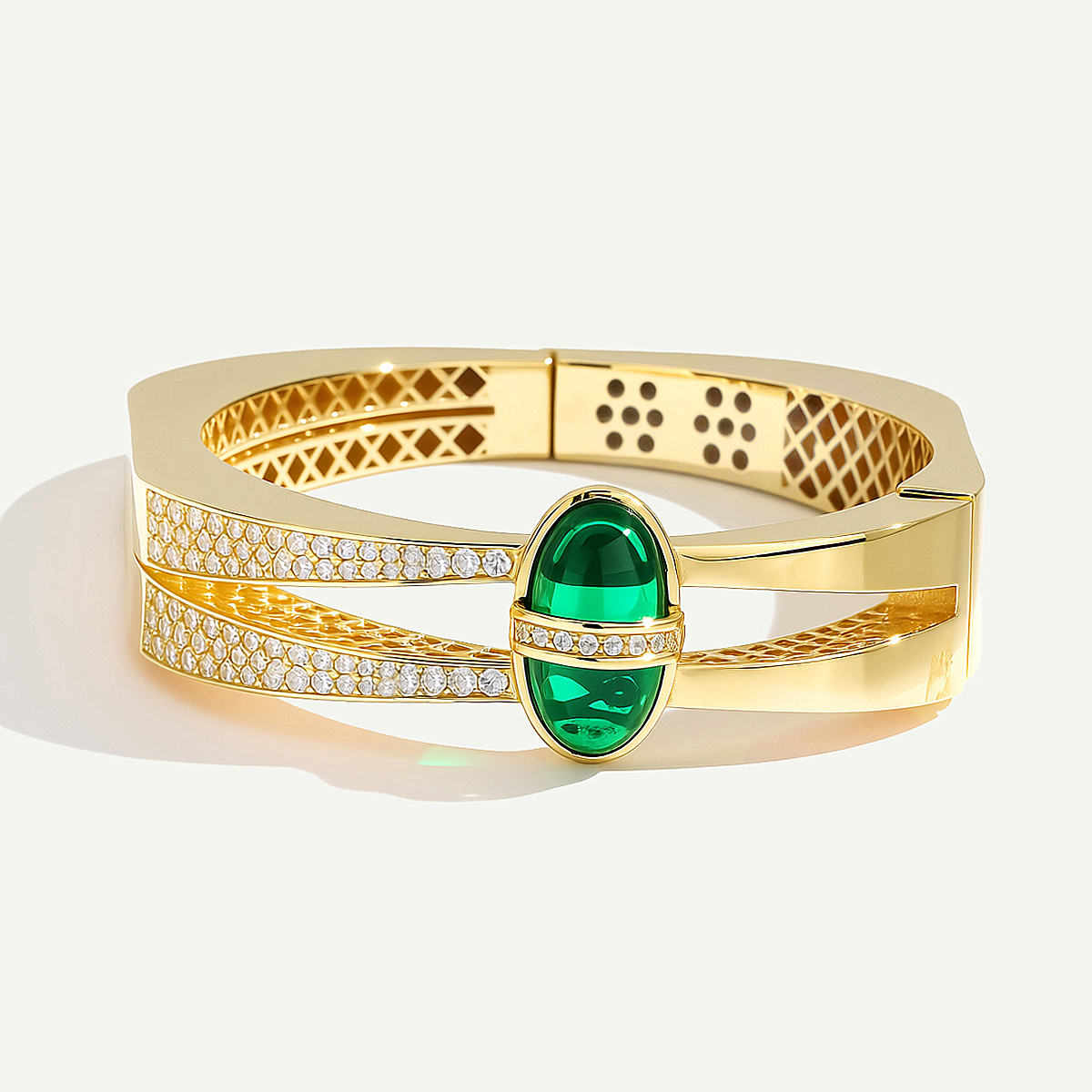 Mimari formu ve cesur taş kullanımıyla dikkat çeken 14 Ayar Altın Oval Formlu Mor Taşlı Kelepçe, zengin ve iddialı bir zarafet sunar. Kelepçenin yan kısmında yer alan pürüzsüz, derin mor renkteki büyük taş, etrafını saran çift sıra parıltılı beyaz taş detayı ile çarpıcı bir kontrast oluşturur. Yüksek parlaklıktaki altından üretilen ve yüzeyinde çift sıra ışıltılı taş detayı taşıyan bu model, iç kısmındaki özel petek deseni ile lüks bir işçiliğe sahiptir. Bu gösterişli parça, özel günlerinizin ve sofistike stilinizin güçlü odak noktası olmaya hazırdır. Regold logolu özel kutusunda ve garanti belgesi ile sunulmaktadır.