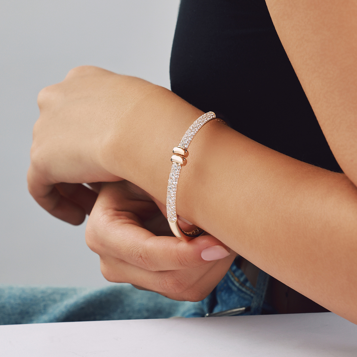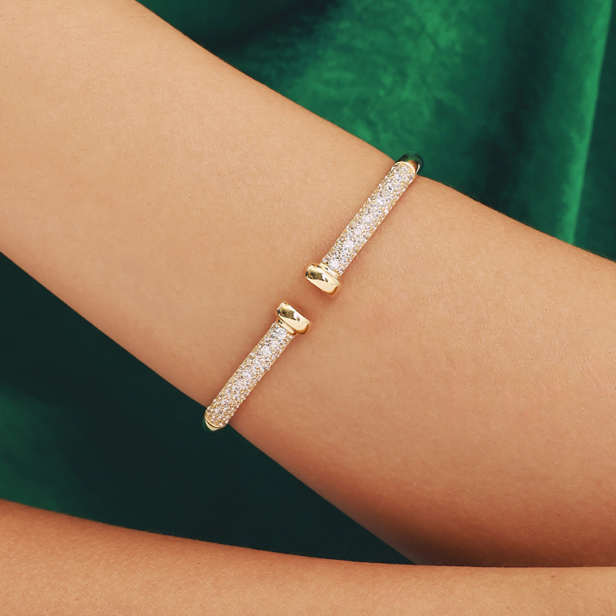 Geleneksel zarafet ile maksimum ışıltıyı birleştiren 14 Ayar Altın Pavé Taşlı Kelepçe, bileğinizde kesintisiz bir parlaklık sunar. Parlak altından üretilen modelin üst yüzeyi, çok sıralı pavé tekniğiyle yerleştirilmiş yüzlerce pırlanta görünümlü beyaz taşla tamamen kaplanmıştır. Bu yoğun taş yüzeyinin ortasında, iki düğüm formunu andıran pürüzsüz ve yuvarlak altın detay, ışıltıyla kusursuz bir tezat oluşturur. İç kısmındaki lüks petek deseni işçilik kalitesini tamamlarken, bu gösterişli parça, tüm özel anlarınızın ve abiye stilinizin vazgeçilmez bir aksesuarı olacaktır. Regold logolu özel kutusunda ve garanti belgesi ile sunulmaktadır.