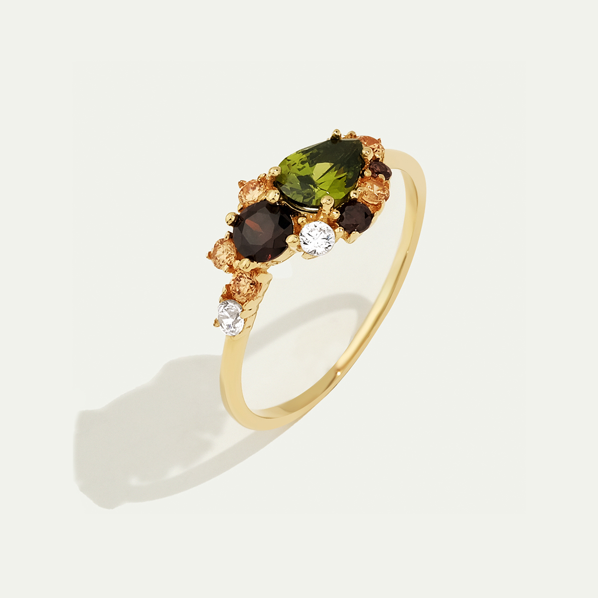Farklı boyut ve renkteki taşların zarif uyumuyla tasarlanan bu 14 ayar altın yüzük, her bakışta farklı bir ışık yakalıyor. Merkezdeki damla kesim yeşil taş, etrafındaki sıcak tonlu ve parlak taşlarla birleşerek sofistike bir kontrast oluşturuyor. Özgün tarzını ve renklerin enerjisini yansıtmak isteyenler için ideal bir seçenek.