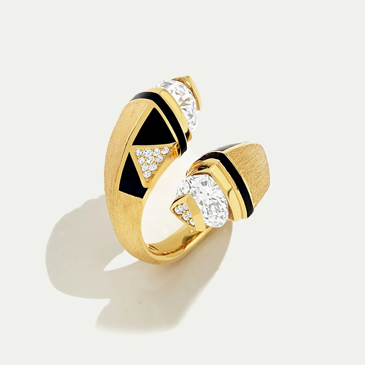 Güçlü hatlara sahip bu yüzük, 14 ayar altının mat dokusunu siyah detayların keskin kontrastıyla buluşturuyor. Uç kısımlarında yer alan büyük parlak taşlar, yüzüğe göz kamaştırıcı bir ihtişam katarken geometrik süslemeler modern bir ifade yaratıyor. Cesur ve sanatsal çizgisiyle bu parça, sıradanlıktan uzak bir şıklık arayanlar için tasarlandı. Regold logolu özel kutusunda ve garanti belgesi ile sunulmaktadır.