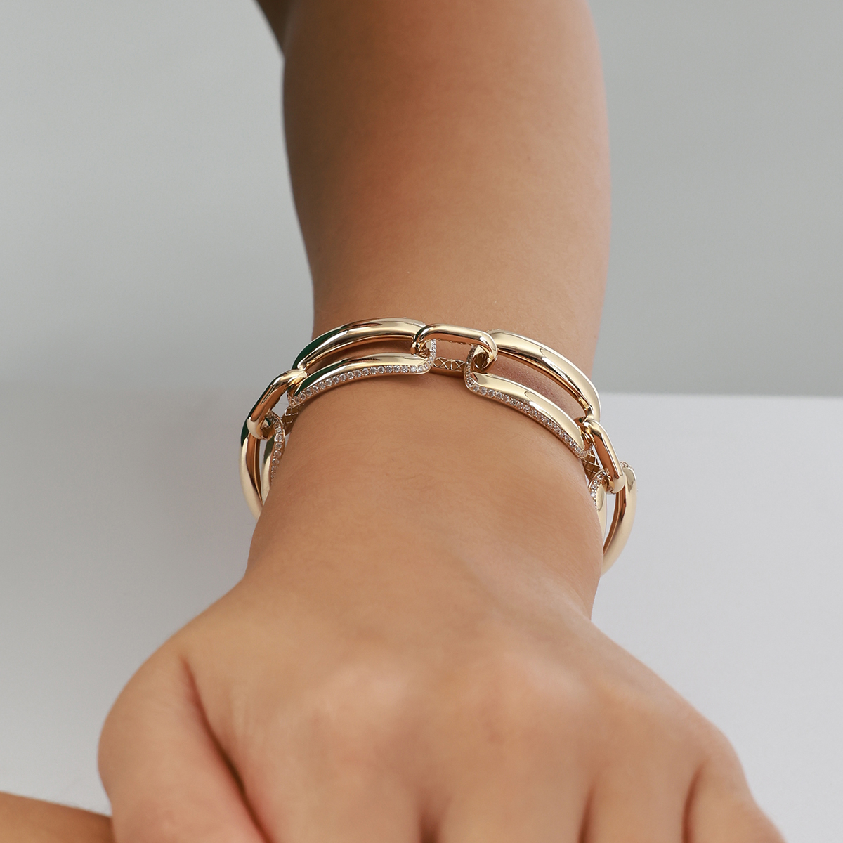 Cesur kare halkalarıyla dikkat çeken bu bileklik, parlak altın yüzeyi ve kenarlarını saran ince taş detaylarıyla modern zarafeti yansıtıyor. Güçlü formu ve göz alıcı ışıltısıyla hem günlük kombinlere hem özel davetlere sofistike bir dokunuş katıyor. Regold logolu özel kutusunda ve garanti belgesiyle sunulmaktadır.