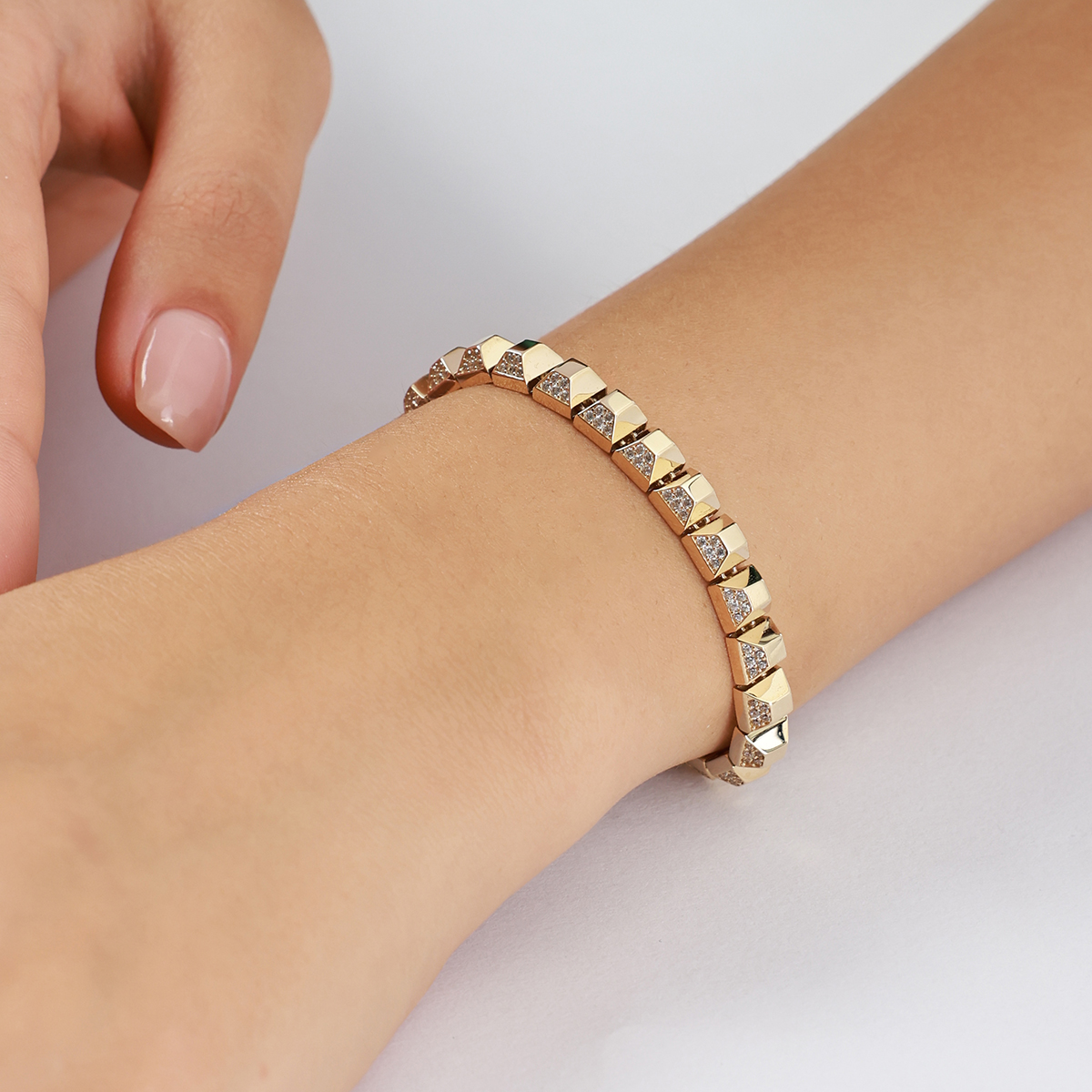 Modern ve zarif çizgileriyle öne çıkan 14 Ayar Altın Taşlı Kare Bileklik, köşeli altın halkaların arasına yerleştirilen pırlanta detaylarla ışıl ışıl bir görünüme sahip. Güçlü formu ve ışıltılı yüzeyiyle klasik şıklığı çağdaş bir dokunuşla buluşturan bu tasarım, her stile sofistike bir tamamlayıcılık katıyor. Regold logolu özel kutusunda ve garanti belgesi ile sunulmaktadır.