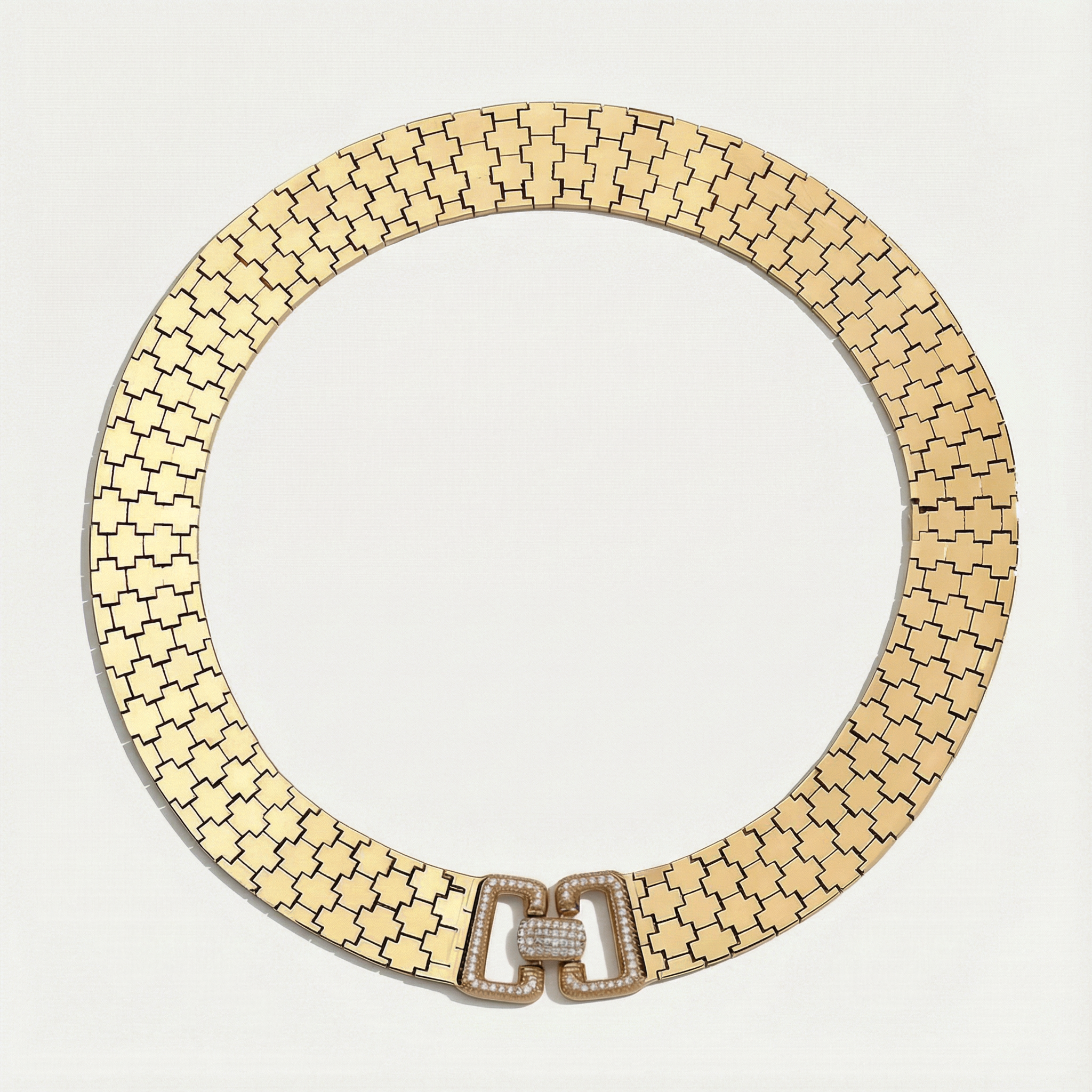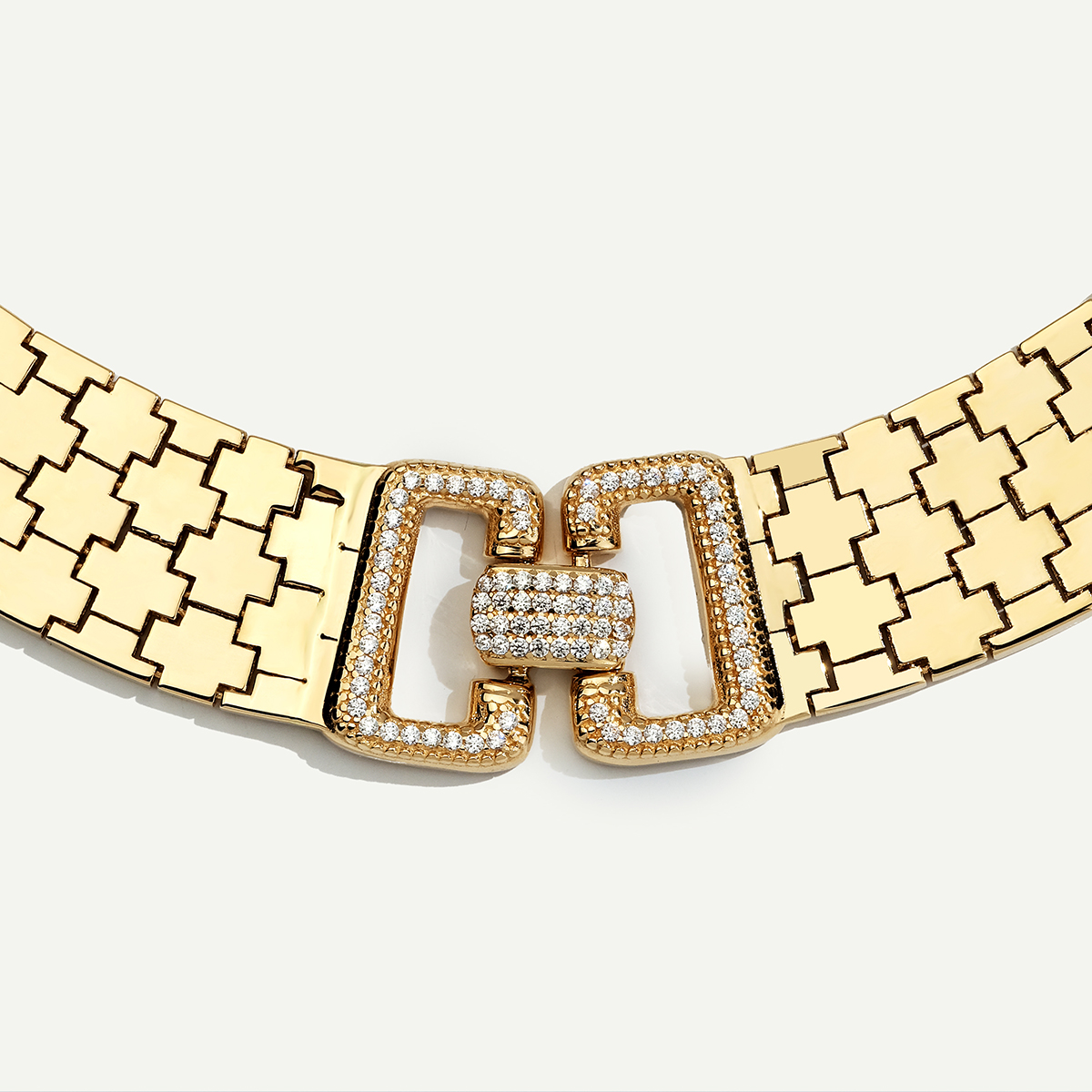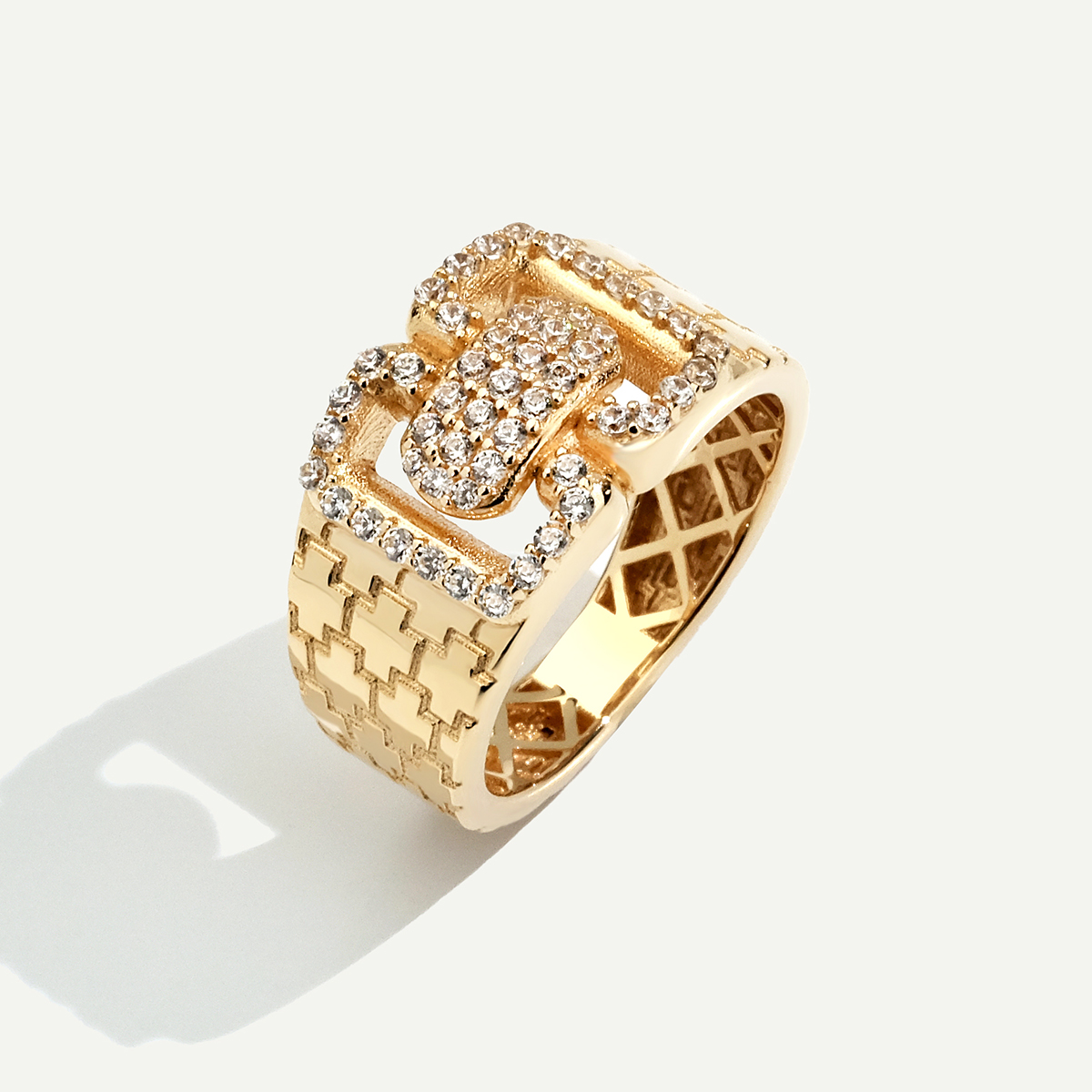 14 ayar altından üretilmiş olup zarafet ve güç hissini bir arada yansıtan oldukça iddialı bir tasarıma sahip. Set, kolye, küpe, bileklik ve yüzükten oluşuyor. Her parçada yer alan geniş yüzeyler, ayna parlaklığında işlenmiş metal dokusuyla ışıltılı bir görünüm sergiliyor. Taşlar, pürüzsüz altın yüzeyin üzerinde zarif bir kontrast oluşturarak ışığı en iyi şekilde yansıtıyor. Kolyenin boyun hattını takip eden kavisli yapısı, bilekliğin ve yüzüğün aynı dokuyu sürdürmesiyle birlikte setin bütünlüğünü tamamlıyor. Modern ve klasik çizgilerin dengelendiği bu tasarım, hem gündüz hem de özel davetlerde dikkat çekici bir duruş sunuyor. Regold logolu özel kutusunda ve garanti belgesiyle sunulmaktadır.