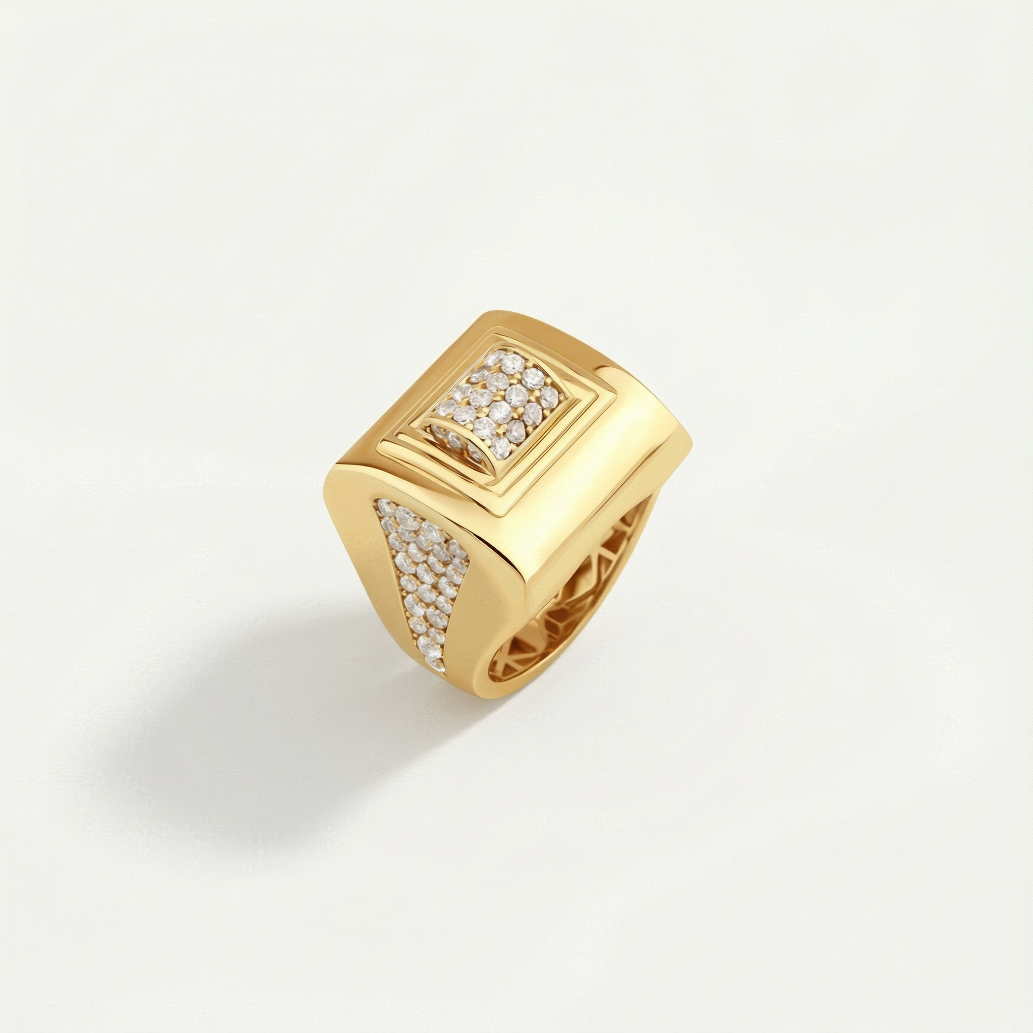 14 Ayar Altın Dikdörtgen Formlu Yüzük, güçlü ve modern tasarımıyla öne çıkar. Üst kısmında yer alan dikdörtgen çerçeve içinde parlak taş süslemeler ve yan yüzeylerdeki detaylar yüzüğe sofistike bir ışıltı kazandırır. Günlük şıklıkta olduğu kadar özel davetlerde de tarzınızı tamamlar.