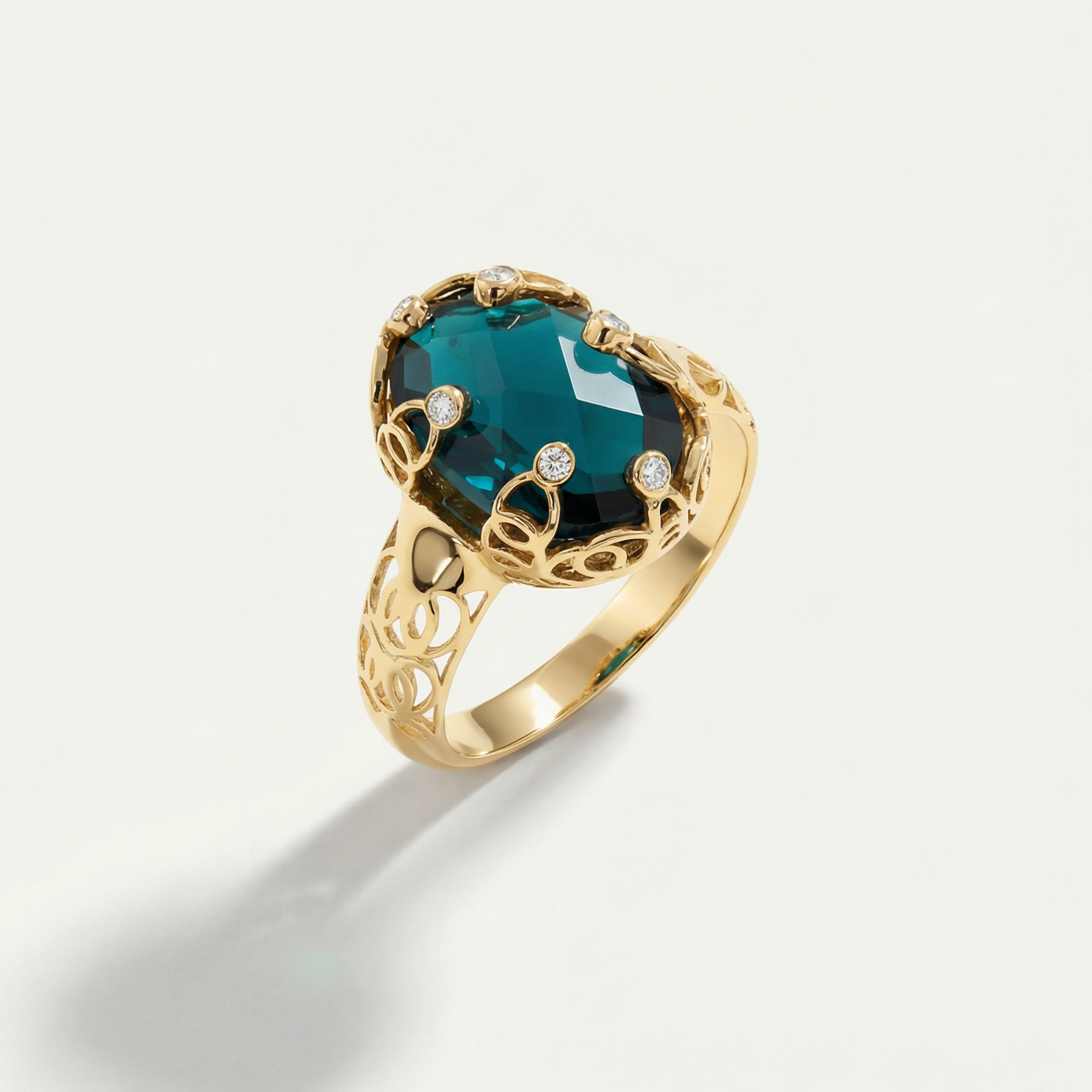Bu zarif 14 Ayar Altın Taşlı Yüzük, ortasında yer alan göz alıcı taş ile dikkat çeker. Özel işçilikle hazırlanmış altın detaylar taşı öne çıkarırken, feminen ve klasik bir görünüm kazandırır. Hem günlük kombinlerinizde hem de özel davetlerde stilinizi tamamlayan güçlü bir aksesuardır.