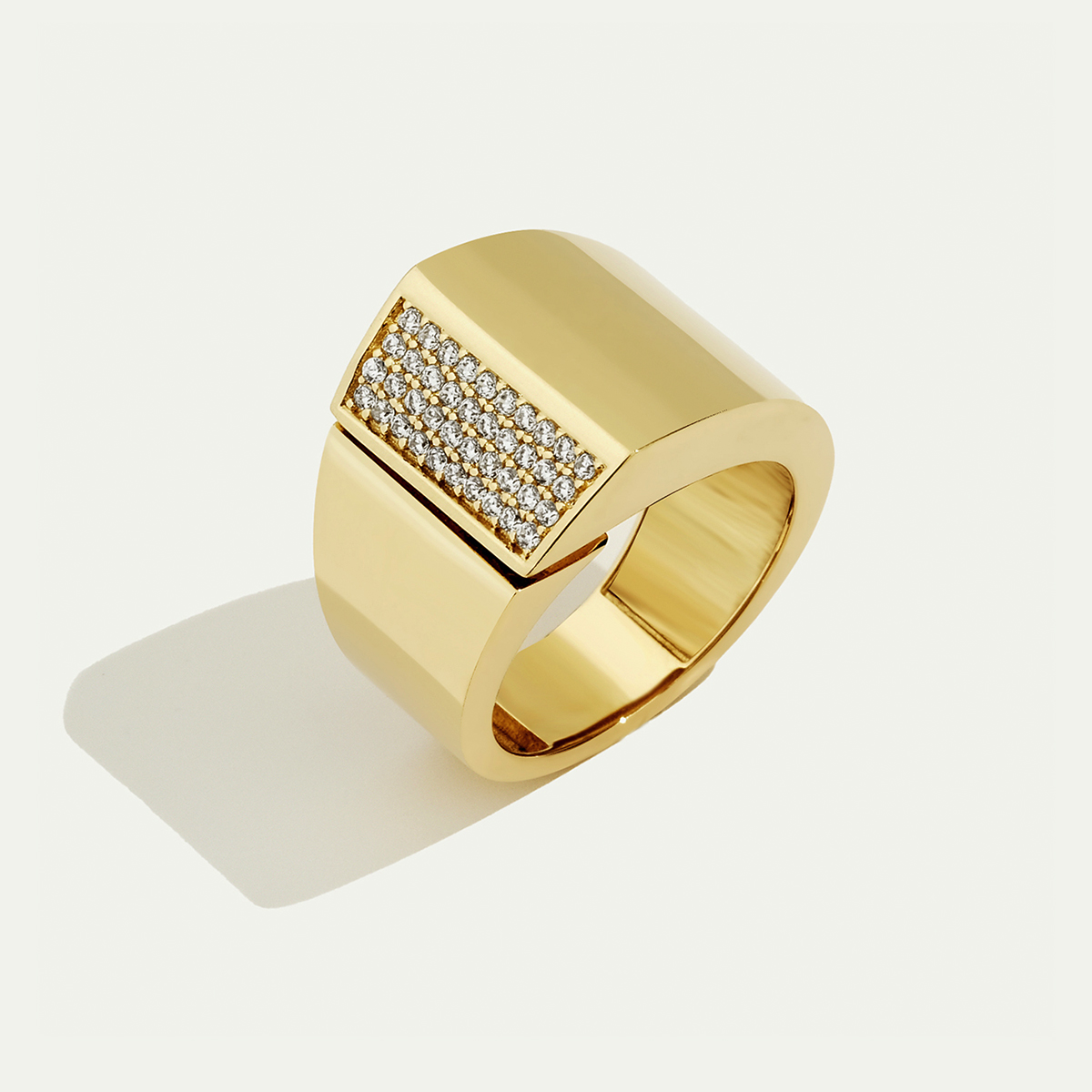 Göz alıcı 14 ayar sarı altından tasarlanan bu yüzük, geniş yüzeyi ve özenle yerleştirilmiş taş detaylarıyla modern ve güçlü bir duruş sergiliyor. Dikdörtgen formda hazırlanmış taşlı bölüm, ışığı maksimum seviyede yansıtarak yüzüğe zarafet katıyor. Hem günlük kullanımda hem de özel davetlerde şıklığınızı tamamlayacak, zamansız bir tasarıma sahiptir. Regold logolu özel kutusunda ve garanti belgesi ile sunulmaktadır.