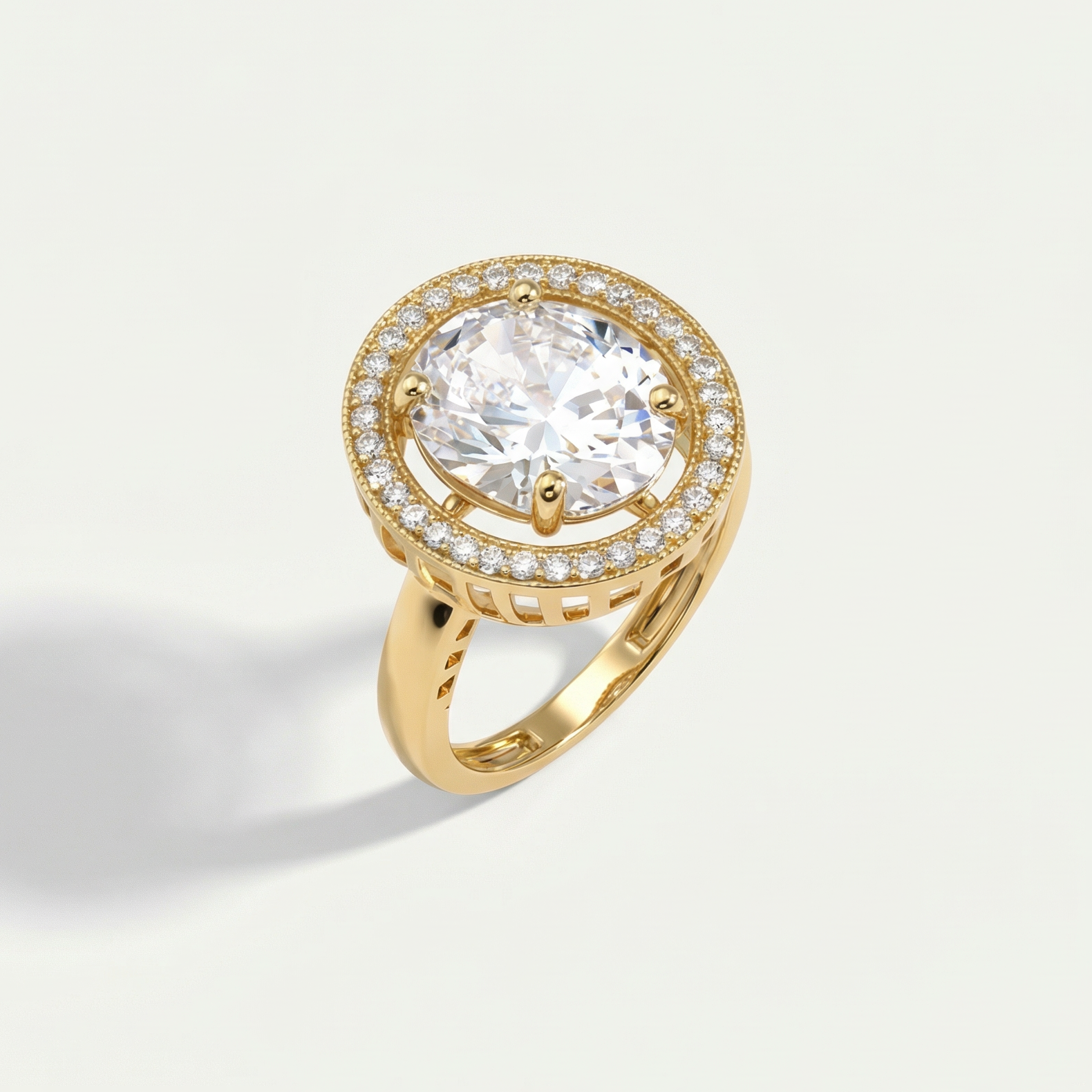 Göz alıcı yuvarlak taşın çevresini saran parlak taşlarla tasarlanan bu 14 ayar altın yüzük, zarafetin en ışıltılı halini sunuyor. Klasik ve modern tasarımın birleşimi olan bu yüzük, özel davetlerden günlük şıklığa kadar her stile uyum sağlar. Işıltısıyla parmaklarda sofistike bir duruş sergileyerek zamansız bir şıklık vadeder.