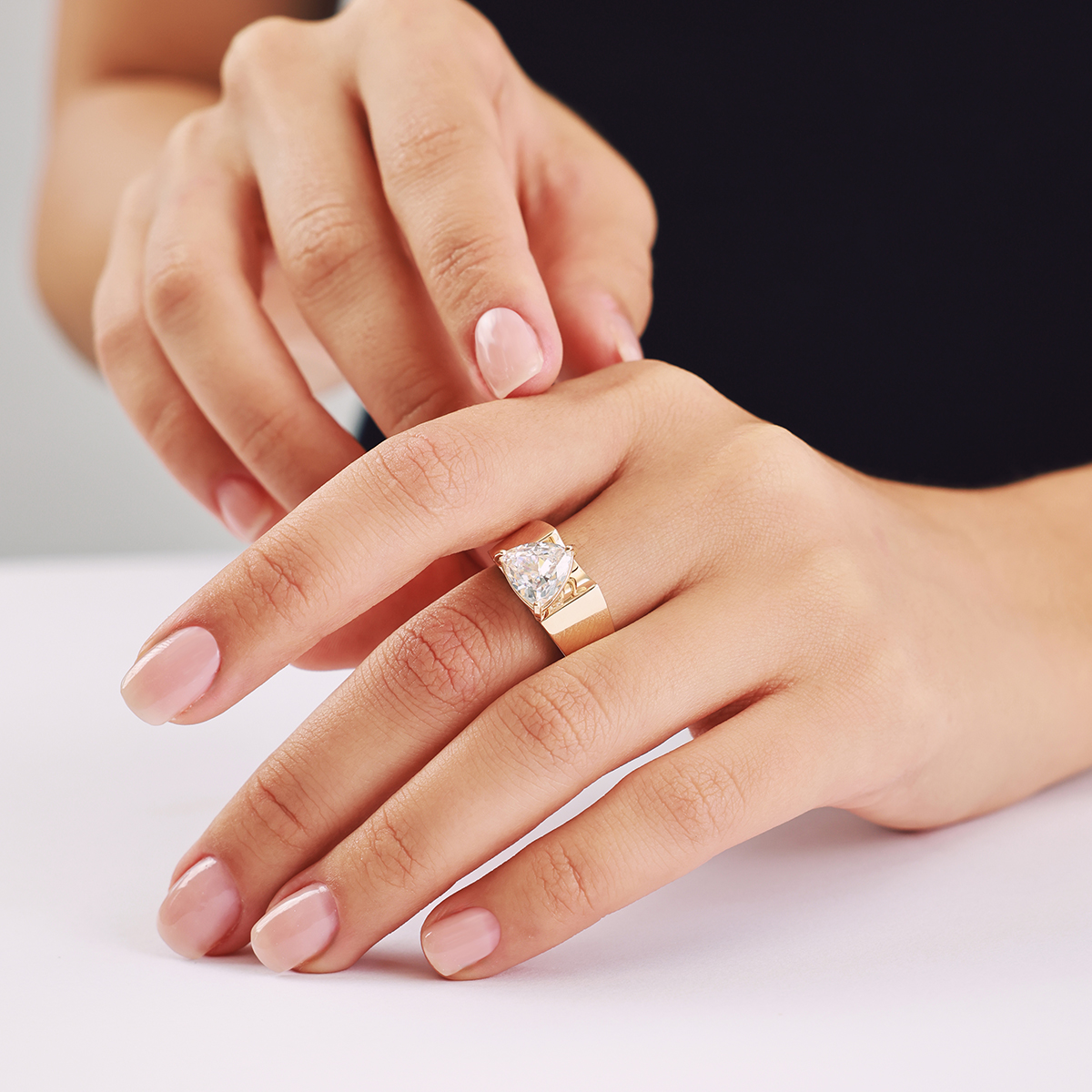 Modern ve dikkat çekici tasarımıyla öne çıkan bu 14 ayar altın yüzük, merkezinde yer alan büyük üçgen kesim süs taşıyla güçlü bir stil ifadesi sunar. Geniş altın yüzeyiyle taşın parlaklığı birleşerek hem günlük kullanımlarda farklı bir şıklık, hem de özel davetlerde iddialı bir görünüm sağlar. Zarif detaylarıyla uzun yıllar severek kullanılabilecek sofistike bir modeldir.