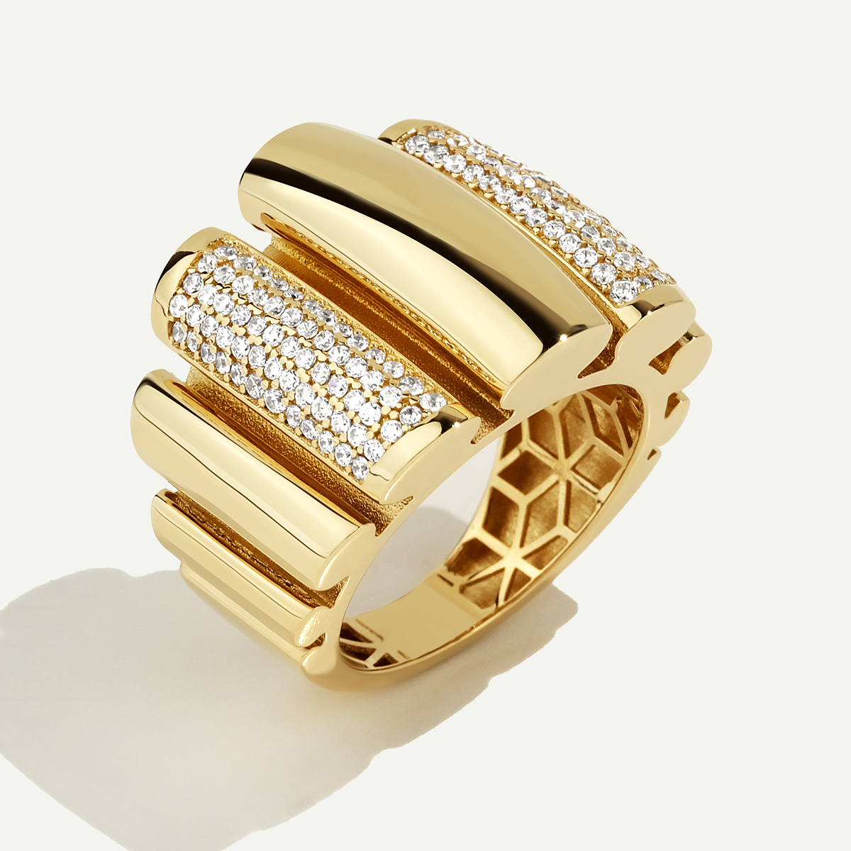 14 Ayar Altın Geniş Form Yüzük, güçlü ve dikkat çekici bir tasarıma sahiptir. Parlak yüzeyler ve yanlarda yer alan taş detaylarıyla modern bir kontrast sunar. Geniş yapısıyla iddialı bir duruş sergilerken, zarif ışıltısıyla hem günlük hem de özel davetlerde stilinizi tamamlar.