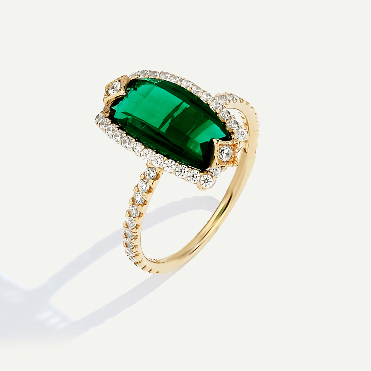 Merkezdeki dikdörtgen kesim yeşil taş, ışıltılı çerçevesiyle birleşerek bu 14 Ayar Altın Yüzük’e göz alıcı bir zarafet kazandırıyor. Rengiyle doğayı çağrıştıran bu tasarım, zarif ve modern bir stil sunar. Regold logolu özel kutusunda ve garanti belgesiyle sunulmaktadır.