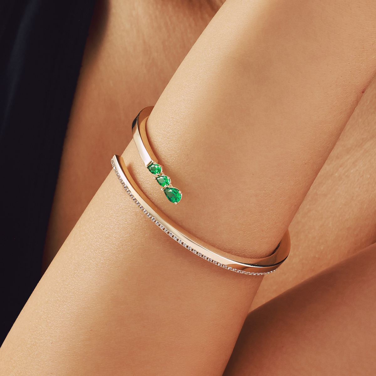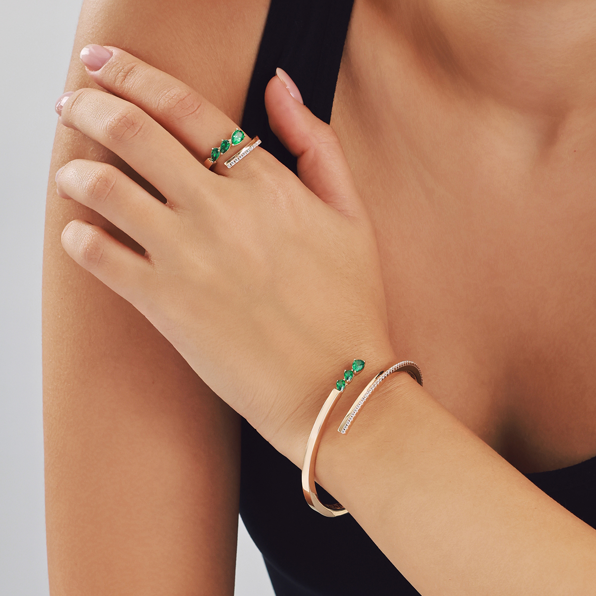 Göz alıcı renkler ve modern akışkan formu birleştiren 14 Ayar Damla Formlu Yeşil Taşlı Yüzük, bileğinizde dinamik bir ışıltı yaratır. Altının parlak yüzeyli açık formu, bir yanda tek sıra parıltılı beyaz taşlarla çevrelenmişken, diğer yanda canlı zümrüt yeşili renkteki üç damla kesim taş ile vurgulanır. Bu asimetrik ve zarif tasarım, kontrastın gücünü ortaya koyar. İç yüzeyindeki lüks petek deseni detayına sahip bu model, modern takı setinizi tamamlamak için mükemmel ve iddialı bir seçimdir. Regold logolu özel kutusunda ve garanti belgesi ile sunulmaktadır.