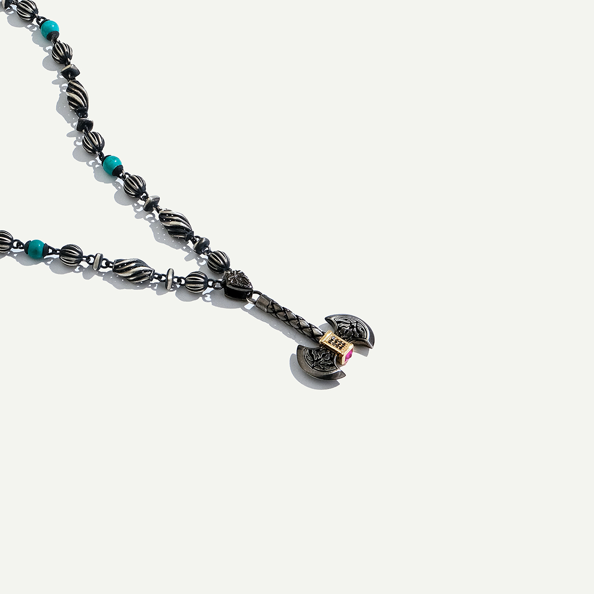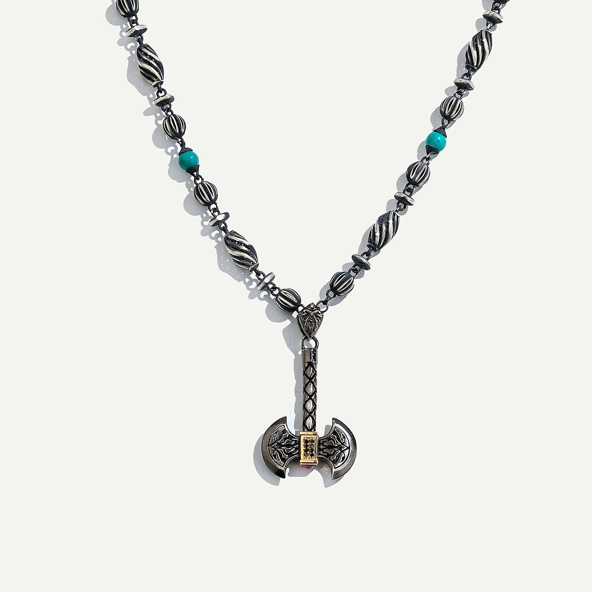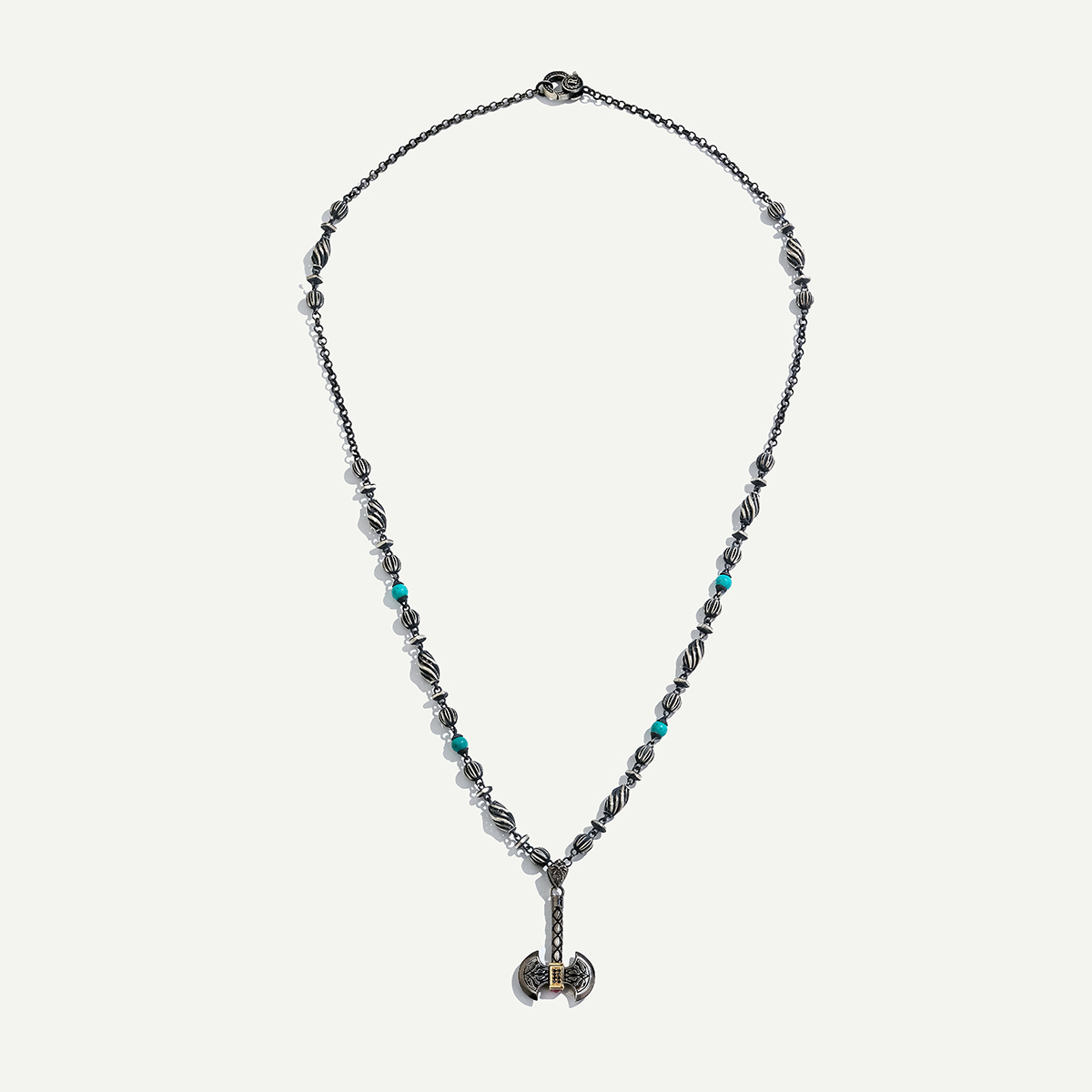 925k Gümüş ve 18 Ayar Altın Çift Taraflı Balta Figürlü Pırlantalı Kolye