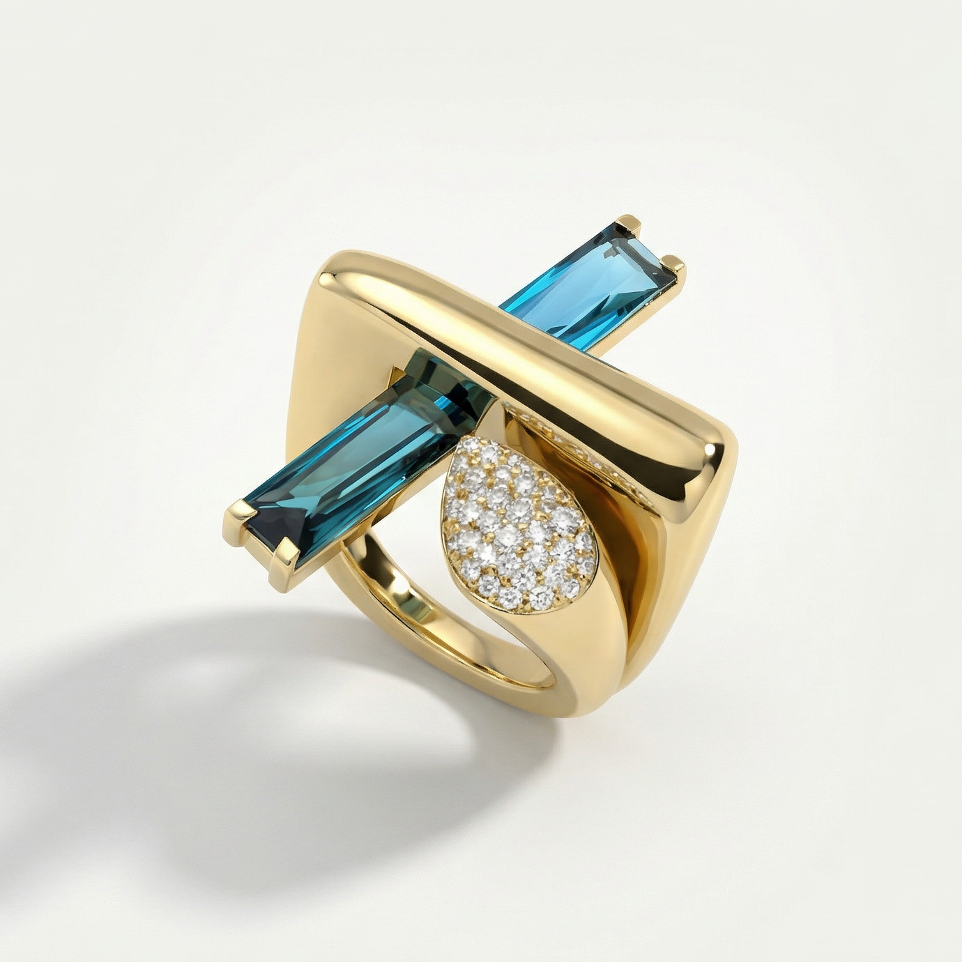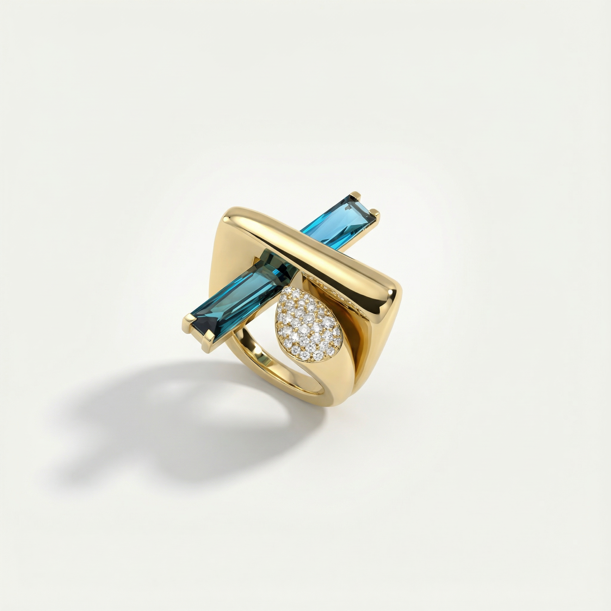 Güçlü geometrik hatları ile Baget 14 Ayar Altın Mavi Damla Taşlı Yüzük, dikkat çekici tasarımıyla öne çıkmaktadır. Üzerinde yer alan işçilikli küçük taş detayları, yüzüğün modern duruşuna zarif bir ışıltı katarken mavi baget taşın yansımasıyla uyumlu bir denge oluşturur. Sanatsal formu sayesinde iddialı ve özgün bir stil sunar. Regold logolu özel kutusunda ve garanti belgesi ile sunulmaktadır.