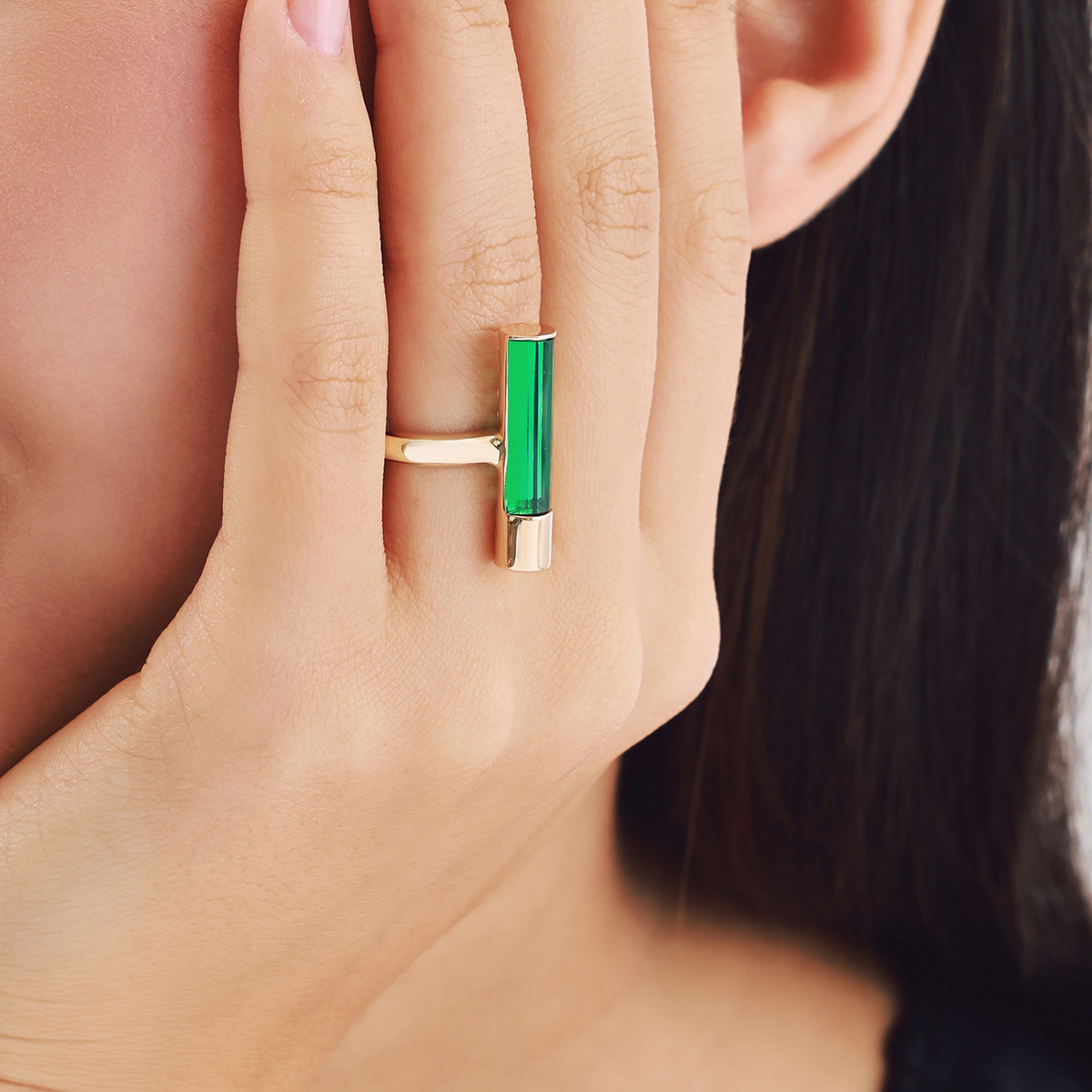 Baget 14 Ayar Altın Dikey Yeşil Taşlı Yüzük