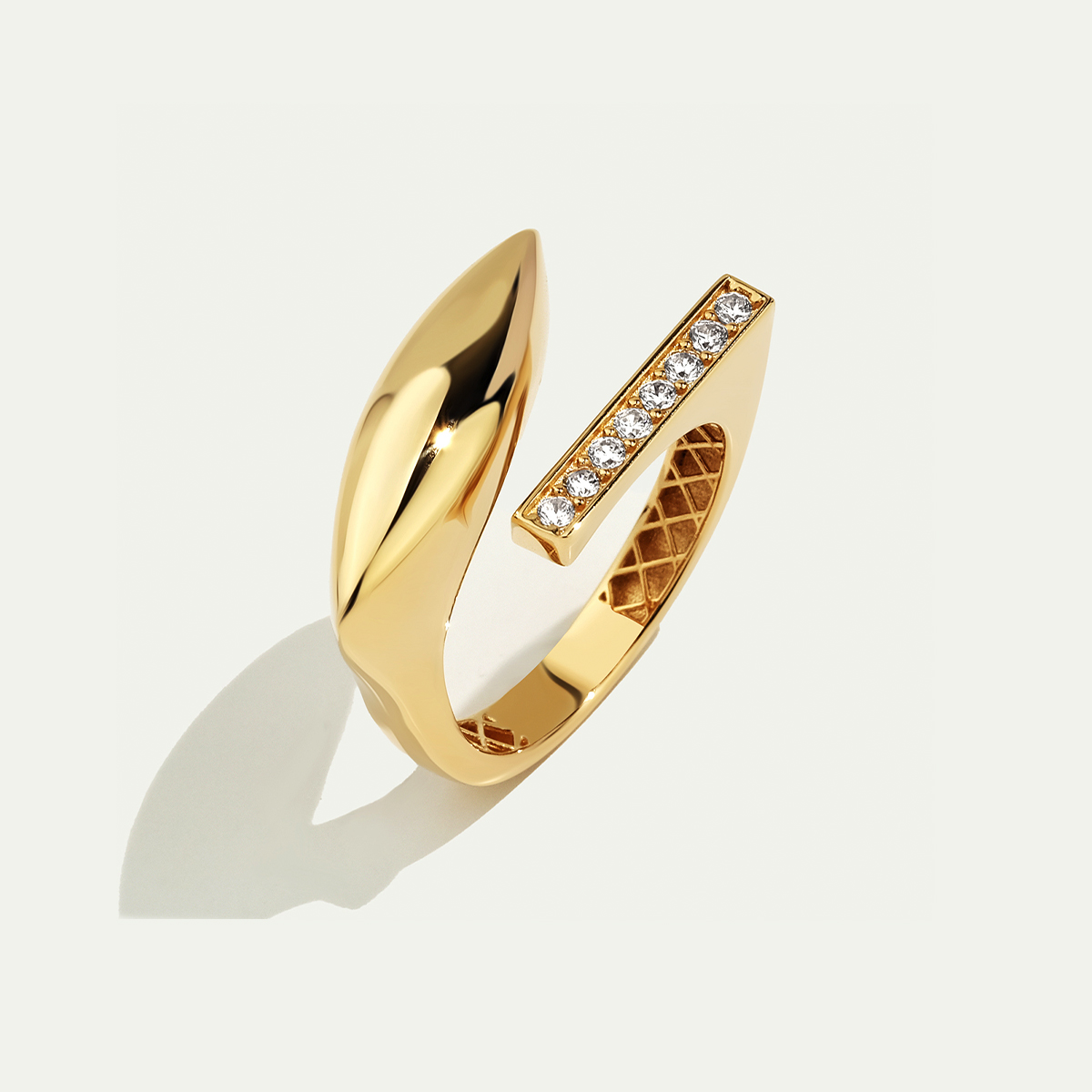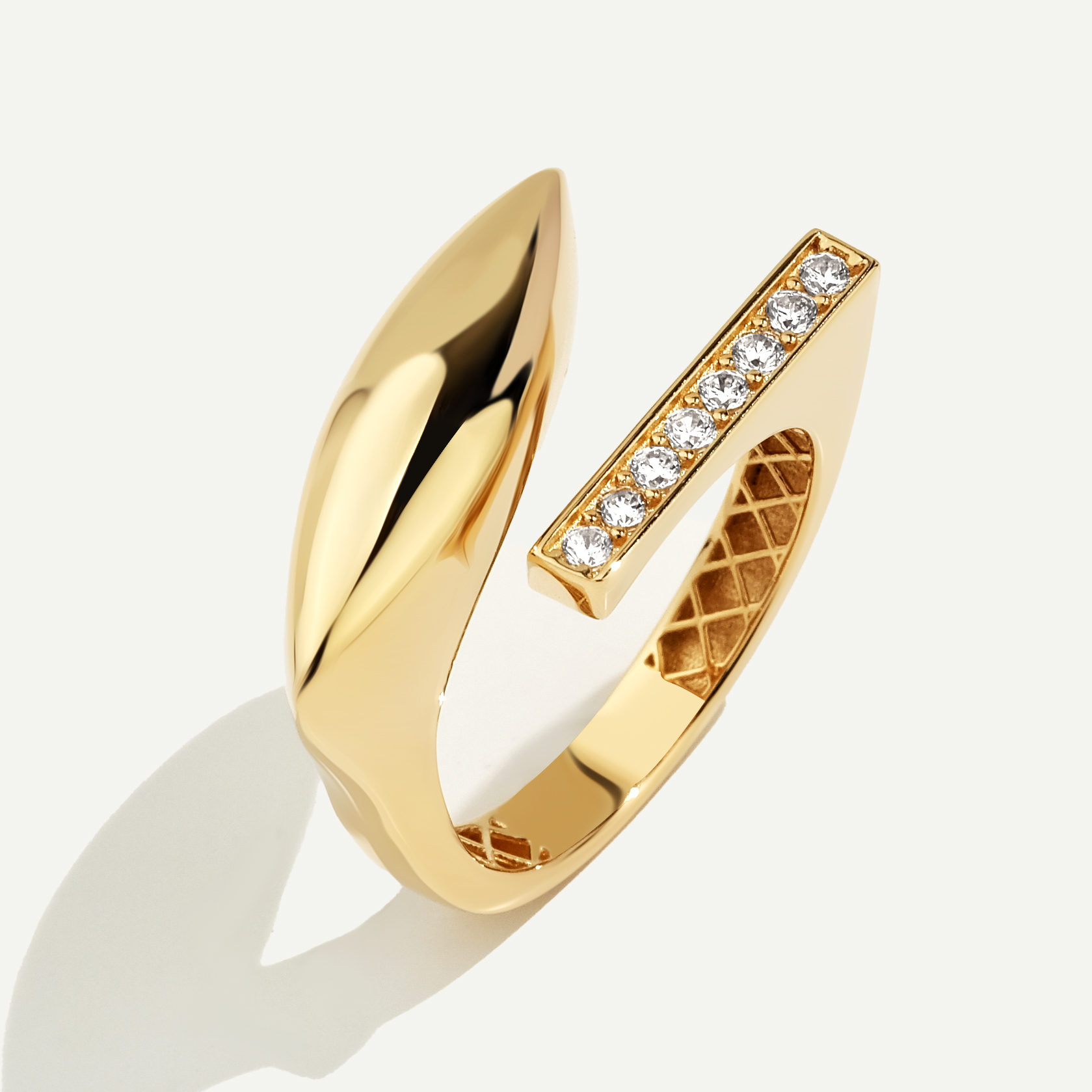 Regold’un Baget 14 Ayar Altın İkili Taşlı Yüzük modeli, modern ve cesur tasarımıyla dikkat çekiyor. Yüzüğün bir yanında zarif pırlanta görünümlü taşlarla süslenmiş dikdörtgen form yer alırken, diğer yanında yalın ve bombeli altın detay bulunuyor. Bu iki farklı formun birleşimi, yüzüğe hem dengeli hem de güçlü bir estetik kazandırıyor. Minimal hatlarıyla günlük kombinlerinize uyum sağlarken, taşların ışıltısıyla özel davetlerde de şıklığınızı ön plana çıkarır. Zamansız altın dokusu ve modern formuyla özgün bir tarz arayanlar için ideal bir seçimdir. Regold logolu özel kutusunda ve garanti belgesi ile sunulmaktadır.