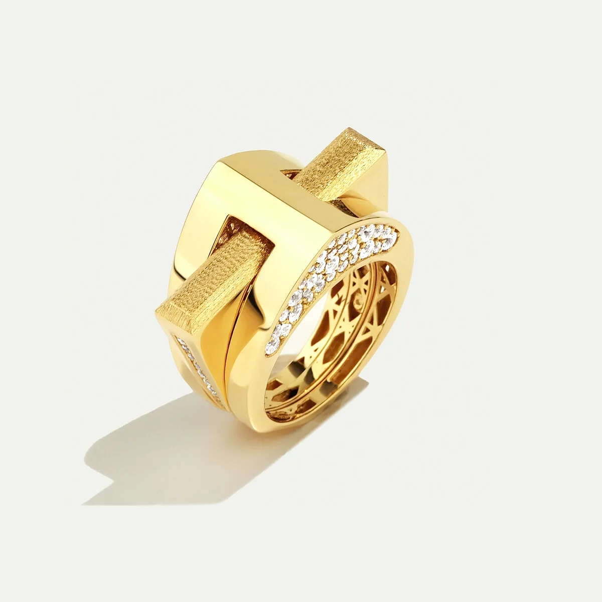 Birbirini tamamlayan iki ayrı yüzükten oluşan Baget 14 Ayar Altın İkili Taşlı Yüzük, birlikte kullanıldığında modern ve zarif bir uyum yakalar. Yüzüklerden biri fırçalanmış yüzeyiyle klasik bir duruş sunarken diğeri yan kısmındaki parlak taş dizilimiyle ışıltılı bir kontrast oluşturur. İki parçanın bir araya gelmesiyle ortaya çıkan bu tasarım, şıklığı zarafetle buluşturan sofistike bir görünüm yaratır. Regold logolu özel kutusunda ve garanti belgesi ile sunulmaktadır.